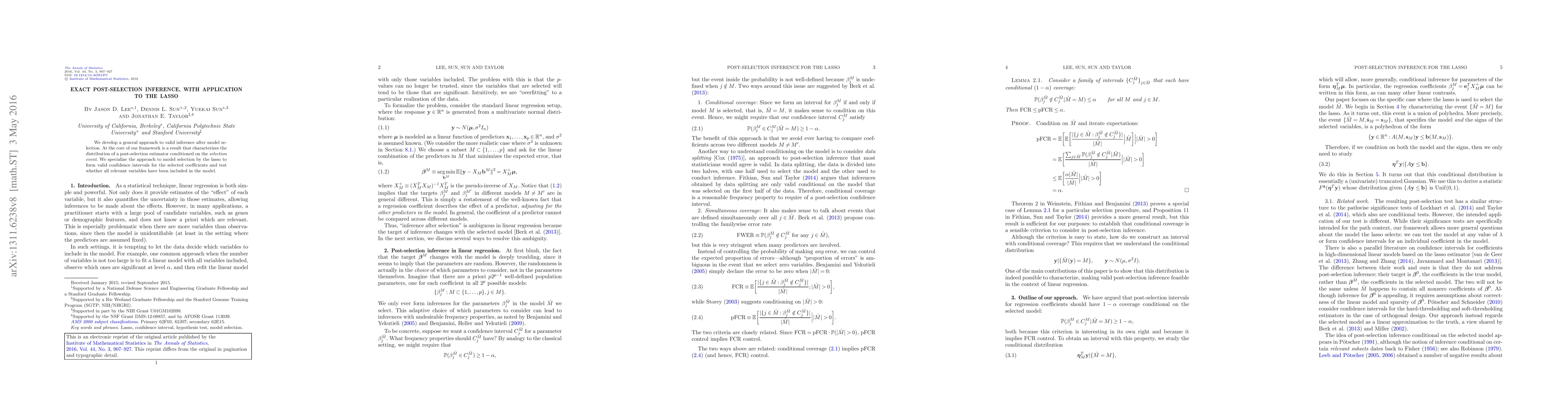 This paper introduces a method for valid inference following model selection, focusing on the lasso. It provides a framework to characterize the distribution of post-selection estimators, enabling the construction of valid confidence intervals for selected coefficients and tests for model completeness.