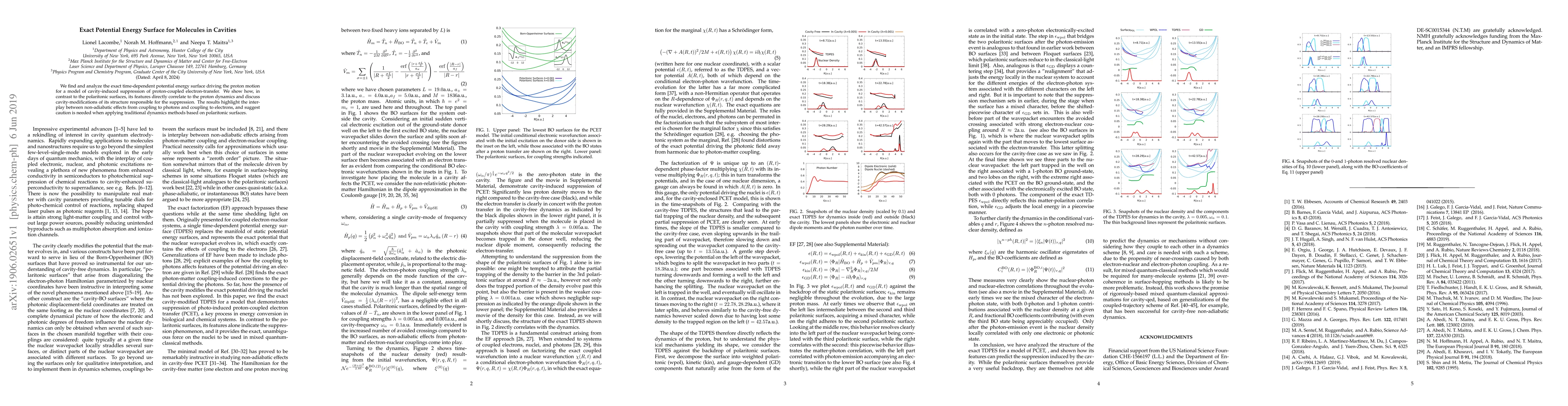 We find and analyze the exact time-dependent potential energy surface driving the proton motion for a model of cavity-induced suppression of proton-coupled electron-transfer. We show how, in contrast to the polaritonic surfaces, its features directly correlate to the proton dynamics and discuss cavity-modifications of its structure responsible for the suppression. The results highlight the interplay between non-adiabatic effects from coupling to photons and coupling to electrons, and suggest caution is needed when applying traditional dynamics methods based on polaritonic surfaces.