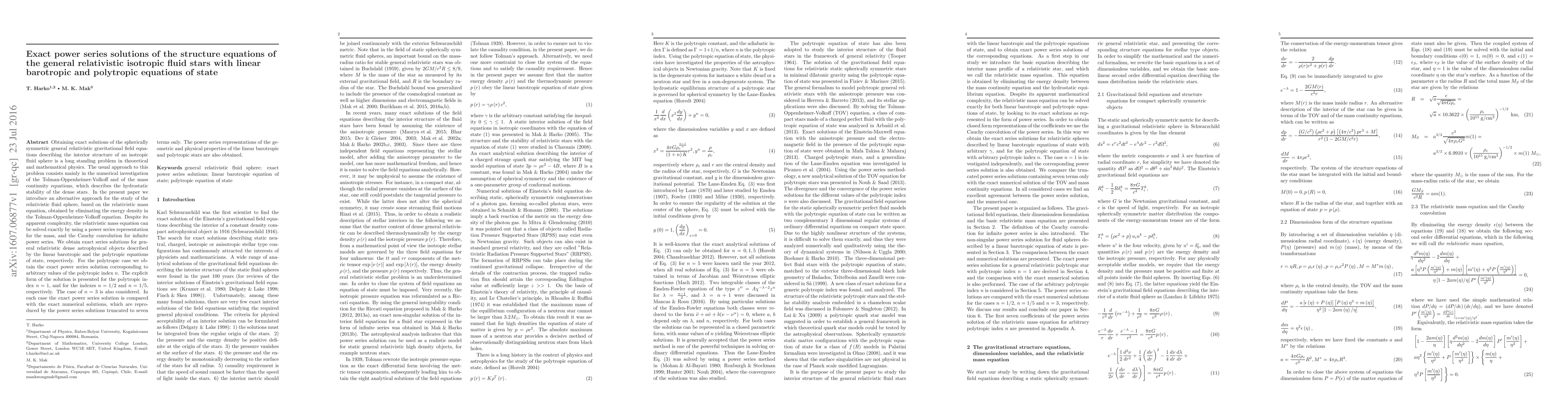 Obtaining exact solutions of the spherically symmetric general relativistic gravitational field equations describing the interior structure of an isotropic fluid sphere is a long standing problem in theoretical and mathematical physics. The usual approach to this problem consists mainly in the numerical investigation of the Tolman-Oppenheimer-Volkoff and of the mass continuity equations, which describes the hydrostatic stability of the dense stars. In the present paper we introduce an alternative approach for the study of the relativistic fluid sphere, based on the relativistic mass equation, obtained by eliminating the energy density in the Tolman-Oppenheimer-Volkoff equation. Despite its apparent complexity, the relativistic mass equation can be solved exactly by using a power series representation for the mass, and the Cauchy convolution for infinite power series. We obtain exact series solutions for general relativistic dense astrophysical objects described by the linear barotropic and the polytropic equations of state, respectively. For the polytropic case we obtain the exact power series solution corresponding to arbitrary values of the polytropic index $n$. The explicit form of the solution is presented for the polytropic index $n=1$, and for the indexes $n=1/2$ and $n=1/5$, respectively. The case of $n=3$ is also considered. In each case the exact power series solution is compared with the exact numerical solutions, which are reproduced by the power series solutions truncated to seven terms only. The power series representations of the geometric and physical properties of the linear barotropic and polytropic stars are also obtained.