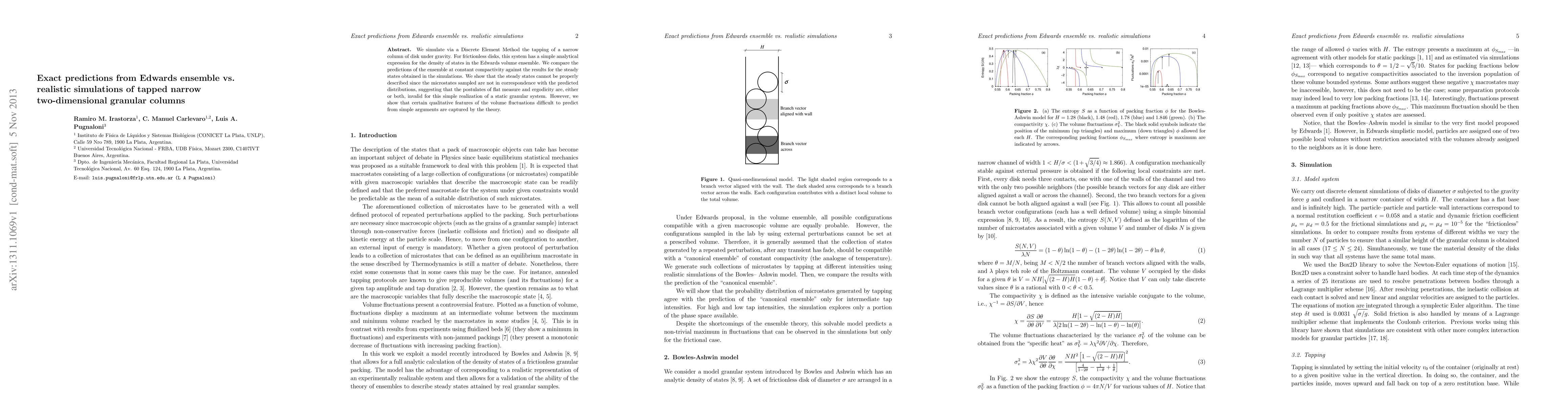 We simulate via a Discrete Element Method the tapping of a narrow column of disk under gravity. For frictionless disks, this system has a simple analytic expression for the density of states in the Edwards volume ensemble. We compare the predictions of the ensemble at constant compactivity against the results for the steady states obtained in the simulations. We show that the steady states cannot be properly described since the microstates sampled are not in correspondence with the predicted distributions, suggesting that the postulates of flat measure and ergodicity are, either or both, invalid for this simple realization of a static granular system. However, we show that certain qualitative features of the volume fluctuations difficult to predict from simple arguments are captured by the theory.