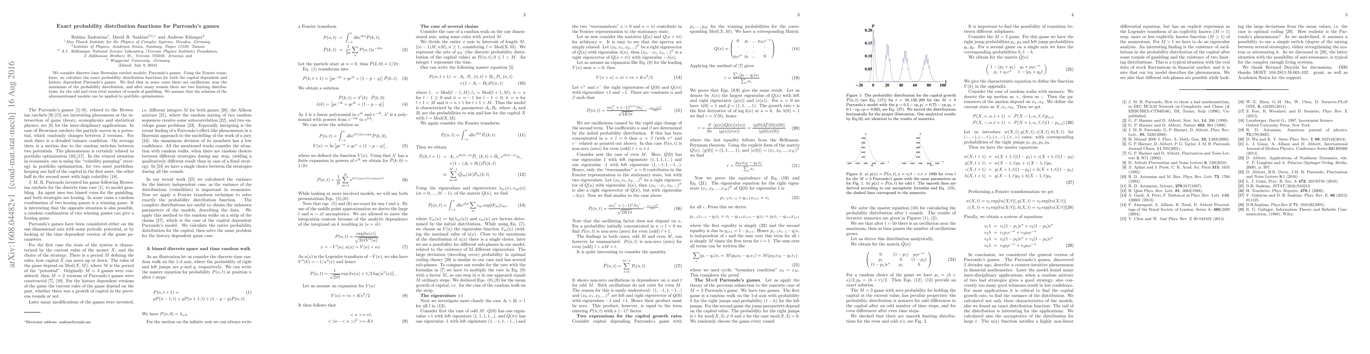 We consider discrete time Brownian ratchet models: Parrondo's games. Using the Fourier transform, we calculate the exact probability distribution functions for both the capital dependent and history dependent Parrondo's games. We find that in some cases there are oscillations near the maximum of the probability distribution, and after many rounds there are two limiting distributions, for the odd and even total number of rounds of gambling. We assume that the solution of the aforementioned models can be applied to portfolio optimization.