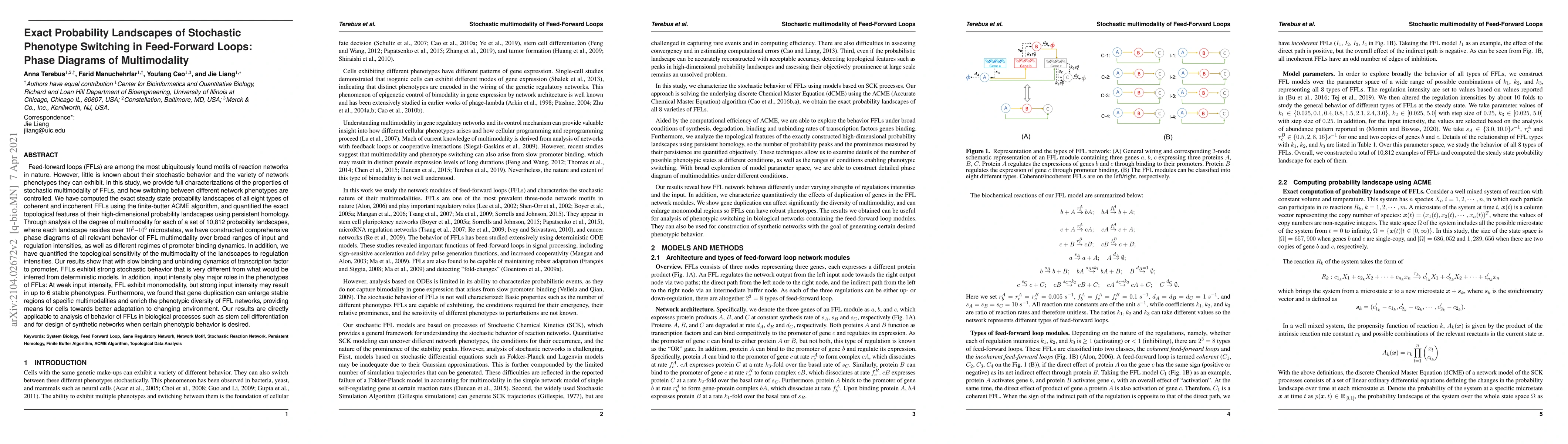 Feed-forward loops (FFLs) are among the most ubiquitously found motifs of reaction networks in nature. However, little is known about their stochastic behavior and the variety of network phenotypes they can exhibit. In this study, we provide full characterizations of the properties of stochastic multimodality of FFLs, and how switching between different network phenotypes are controlled. We have computed the exact steady state probability landscapes of all eight types of coherent and incoherent FFLs using the finite-butter ACME algorithm, and quantified the exact topological features of their high-dimensional probability landscapes using persistent homology. Through analysis of the degree of multimodality for each of a set of 10,812 probability landscapes, where each landscape resides over 10^5-10^6 microstates, we have constructed comprehensive phase diagrams of all relevant behavior of FFL multimodality over broad ranges of input and regulation intensities, as well as different regimes of promoter binding dynamics. Our results show that with slow binding and unbinding dynamics of transcription factor to promoter, FFLs exhibit strong stochastic behavior that is very different from what would be inferred from deterministic models. In addition, input intensity play major roles in the phenotypes of FFLs: At weak input intensity, FFL exhibit monomodality, but strong input intensity may result in up to 6 stable phenotypes. Furthermore, we found that gene duplication can enlarge stable regions of specific multimodalities and enrich the phenotypic diversity of FFL networks, providing means for cells towards better adaptation to changing environment. Our results are directly applicable to analysis of behavior of FFLs in biological processes such as stem cell differentiation and for design of synthetic networks when certain phenotypic behavior is desired.