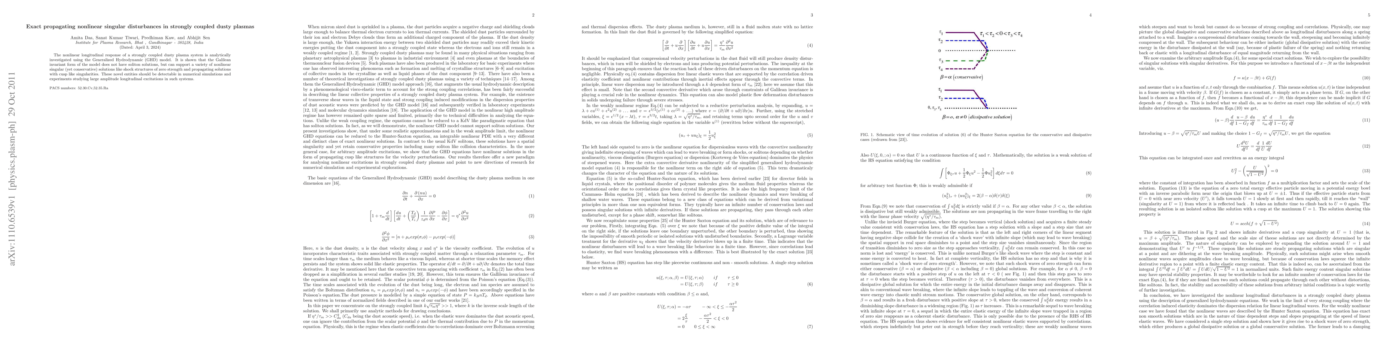 The nonlinear longitudinal response of a strongly coupled dusty plasma system is analytically investigated using the Generalized Hydrodynamic (GHD) model. It is shown that the Galilean invariant form of the model does not have soliton solutions, but can support a variety of nonlinear singular (yet conservative) solutions like shock structures of zero strength and propagating solutions with cusp like singularities. These novel entities should be detectable in numerical simulations and experiments studying large amplitude longitudinal excitations in such systems.