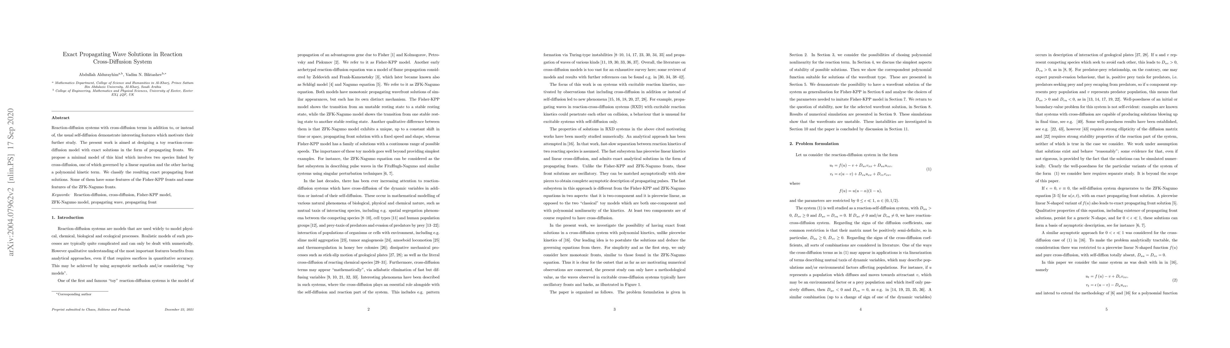 This paper develops a minimal reaction-cross-diffusion model with two species, one linear and one polynomial, to find exact propagating front solutions. The solutions exhibit characteristics of both Fisher-KPP and ZFK-Nagumo fronts, providing insights into reaction-diffusion systems with cross-diffusion.