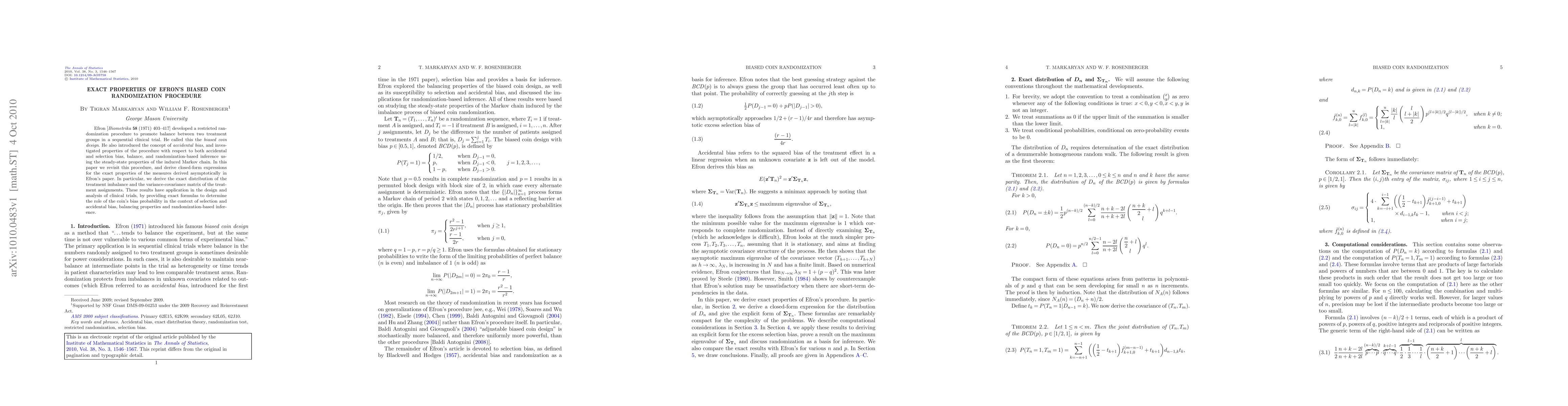 Efron [Biometrika 58 (1971) 403--417] developed a restricted randomization procedure to promote balance between two treatment groups in a sequential clinical trial. He called this the biased coin design. He also introduced the concept of accidental bias, and investigated properties of the procedure with respect to both accidental and selection bias, balance, and randomization-based inference using the steady-state properties of the induced Markov chain. In this paper we revisit this procedure, and derive closed-form expressions for the exact properties of the measures derived asymptotically in Efron's paper. In particular, we derive the exact distribution of the treatment imbalance and the variance-covariance matrix of the treatment assignments. These results have application in the design and analysis of clinical trials, by providing exact formulas to determine the role of the coin's bias probability in the context of selection and accidental bias, balancing properties and randomization-based inference.