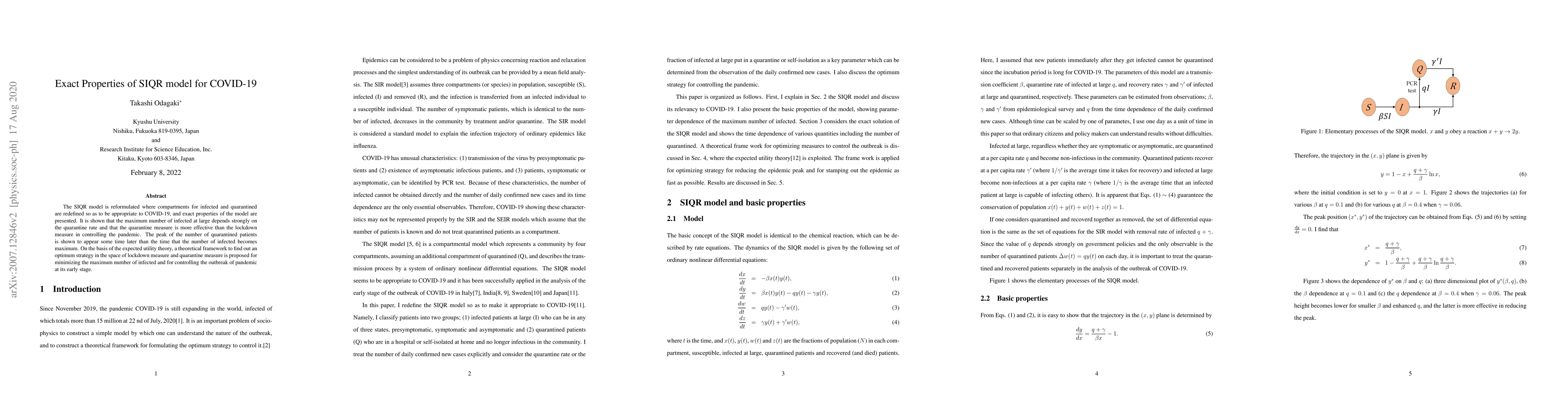The SIQR model is reformulated where compartments for infected and quarantined are redefined so as to be appropriate to COVID-19, and exact properties of the model are presented. It is shown that the maximum number of infected at large depends strongly on the quarantine rate and that the quarantine measure is more effective than the lockdown measure in controlling the pandemic. The peak of the number of quarantined patients is shown to appear some time later than the time that the number of infected becomes maximum. On the basis of the expected utility theory, a theoretical framework to find out an optimum strategy in the space of lockdown measure and quarantine measure is proposed for minimizing the maximum number of infected and for controlling the outbreak of pandemic at its early stage.