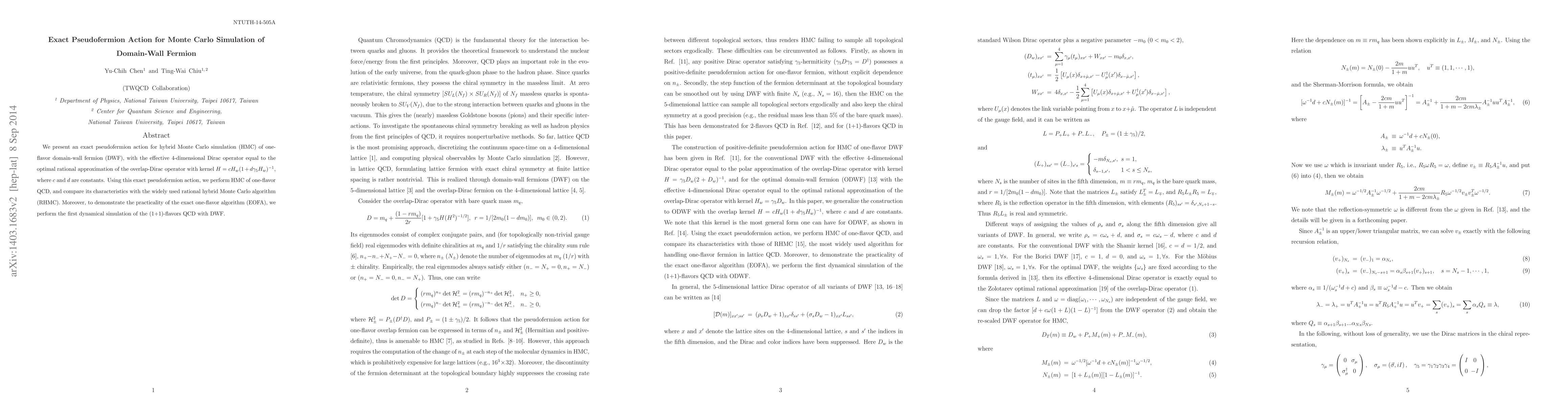 We present an exact pseudofermion action for hybrid Monte Carlo simulation (HMC) of one-flavor domain-wall fermion (DWF), with the effective 4-dimensional Dirac operator equal to the optimal rational approximation of the overlap-Dirac operator with kernel $ H = c H_w (1 + d \gamma_5 H_w)^{-1} $, where $ c $ and $ d $ are constants. Using this exact pseudofermion action, we perform HMC of one-flavor QCD, and compare its characteristics with the widely used rational hybrid Monte Carlo algorithm (RHMC). Moreover, to demonstrate the practicality of the exact one-flavor algorithm (EOFA), we perform the first dynamical simulation of the (1+1)-flavors QCD with DWF.