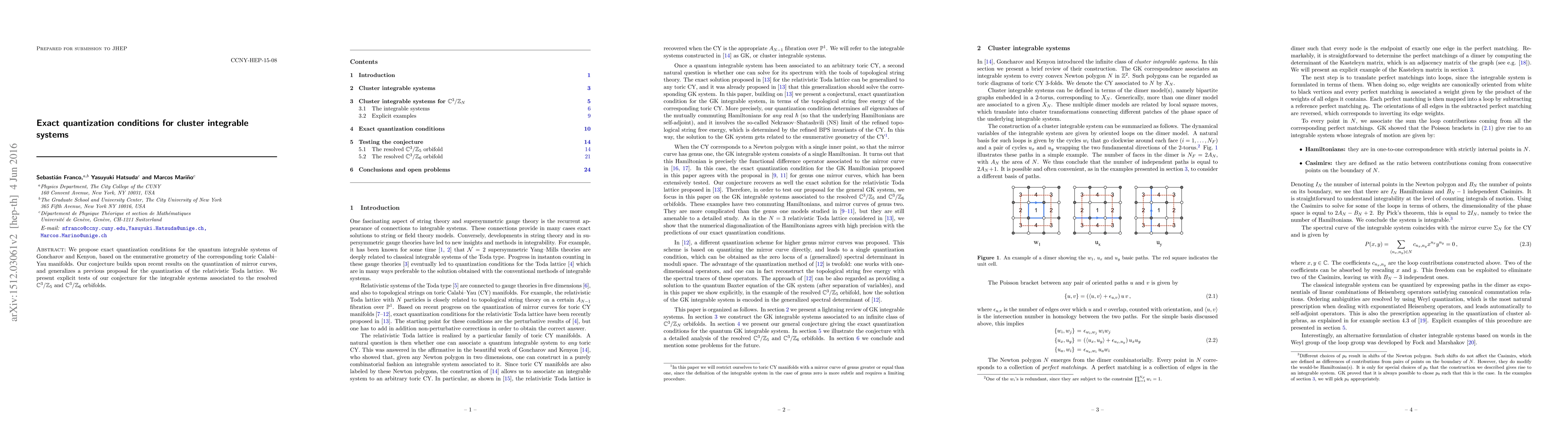 We propose exact quantization conditions for the quantum integrable systems of Goncharov and Kenyon, based on the enumerative geometry of the corresponding toric Calabi-Yau manifolds. Our conjecture builds upon recent results on the quantization of mirror curves, and generalizes a previous proposal for the quantization of the relativistic Toda lattice. We present explicit tests of our conjecture for the integrable systems associated to the resolved C^3/Z_5 and C^3/Z_6 orbifolds.