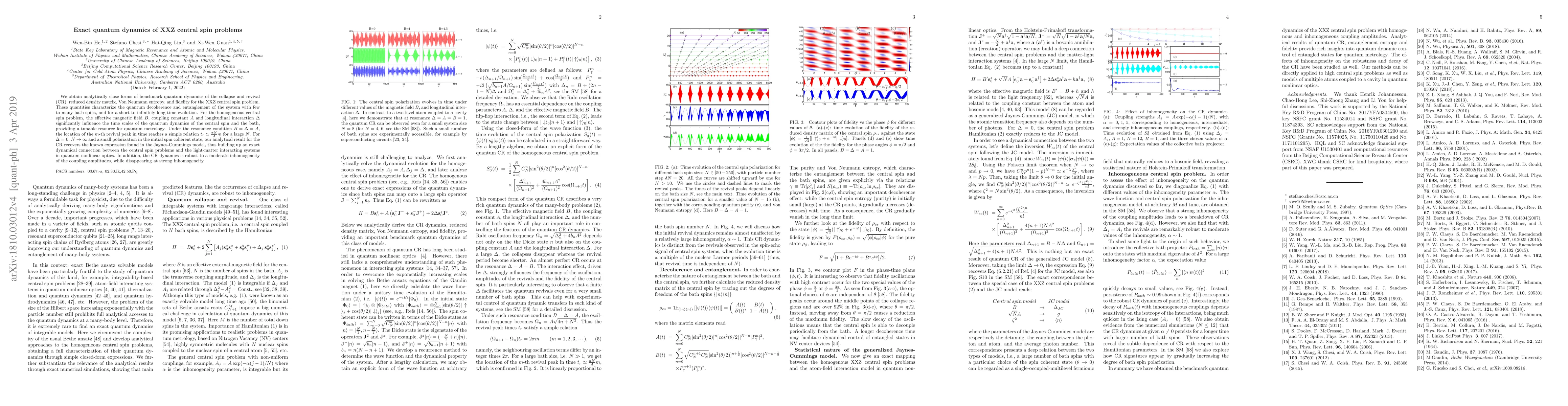 We obtain analytically close forms of benchmark quantum dynamics of the collapse and revival (CR), reduced density matrix, Von Neumann entropy, and fidelity for the XXZ central spin problem. These quantities characterize the quantum decoherence and entanglement of the system with few to many bath spins, and for a short to infinitely long time evolution. For the homogeneous central spin problem, the effective magnetic field $B$, coupling constant $A$ and longitudinal interaction $\Delta$ significantly influence the time scales of the quantum dynamics of the central spin and the bath, providing a tunable resource for quantum metrology. Under the resonance condition $B=\Delta=A$, the location of the $m$-th revival peak in time reaches a simple relation $t_{r} \simeq\frac{\pi N}{A} m$ for a large $N$. For $\Delta =0$, $N\to \infty$ and a small polarization in the initial spin coherent state, our analytical result for the CR recovers the known expression found in the Jaynes-Cummings model, thus building up an exact dynamical connection between the central spin problems and the light-matter interacting systems in quantum nonlinear optics. In addition, the CR dynamics is robust to a moderate inhomogeneity of the coupling amplitudes, while disappearing at strong inhomogeneity.