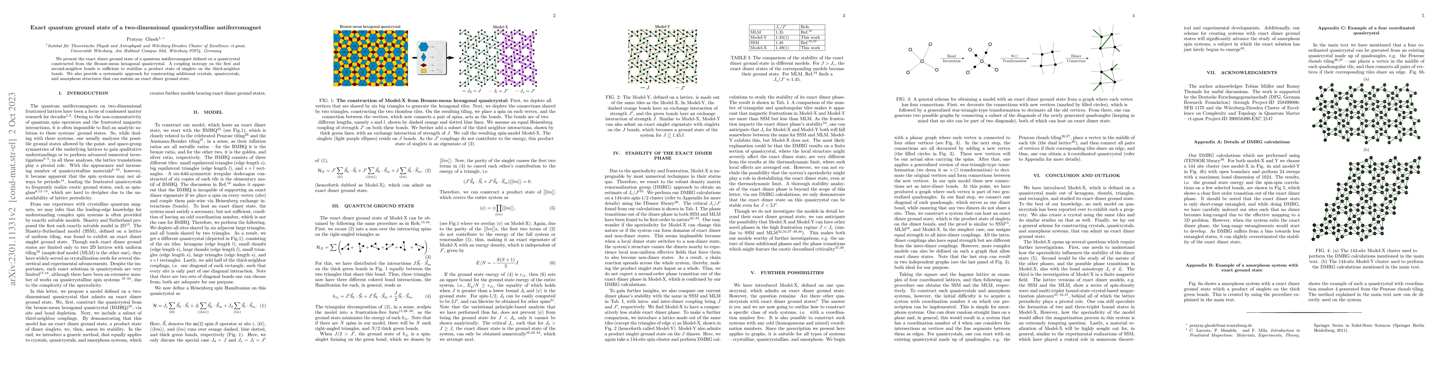This paper presents the exact dimer ground state of a two-dimensional quasicrystalline antiferromagnet based on a Bronze-mean hexagonal quasicrystal, demonstrating that coupling isotropy on first and second-neighbor bonds stabilizes singlets on third-neighbor bonds. It also outlines a method for creating other crystals and quasicrystals with similar exact dimer ground states.