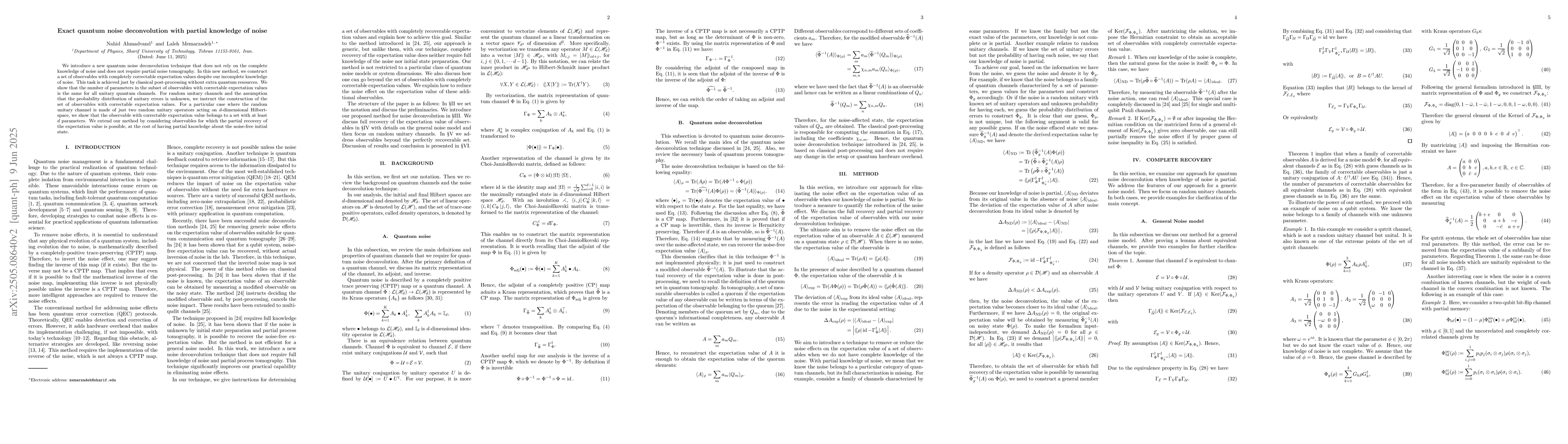 The paper presents a new quantum noise deconvolution technique that operates without complete noise knowledge and uses classical post-processing, distinguishing it from existing methods requiring quantum resources or full noise characterization.