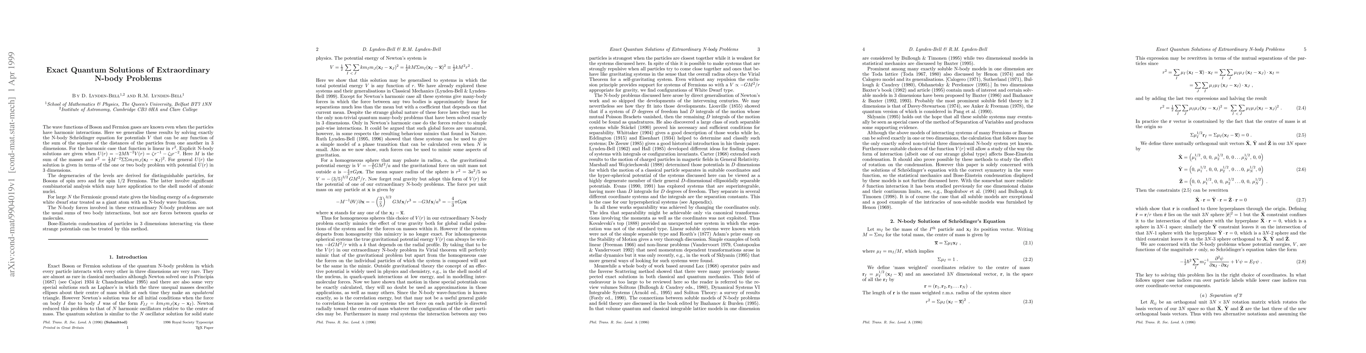 The wave functions of Boson and Fermion gases are known even when the particles have harmonic interactions. Here we generalise these results by solving exactly the N-body Schrodinger equation for potentials V that can be any function of the sum of the squares of the distances of the particles from one another in 3 dimensions. For the harmonic case that function is linear in r^2. Explicit N-body solutions are given when U(r) = -2M \hbar^{-2} V(r) = \zeta r^{-1} - \zeta_2 r^{-2}. Here M is the sum of the masses and r^2 = 1/2 M^{-2} Sigma Sigma m_I m_J ({\bf x}_I - {\bf x}_J)^2. For general U(r) the solution is given in terms of the one or two body problem with potential U(r) in 3 dimensions. The degeneracies of the levels are derived for distinguishable particles, for Bosons of spin zero and for spin 1/2 Fermions. The latter involve significant combinatorial analysis which may have application to the shell model of atomic nuclei. For large N the Fermionic ground state gives the binding energy of a degenerate white dwarf star treated as a giant atom with an N-body wave function. The N-body forces involved in these extraordinary N-body problems are not the usual sums of two body interactions, but nor are forces between quarks or molecules. Bose-Einstein condensation of particles in 3 dimensions interacting via these strange potentials can be treated by this method.
