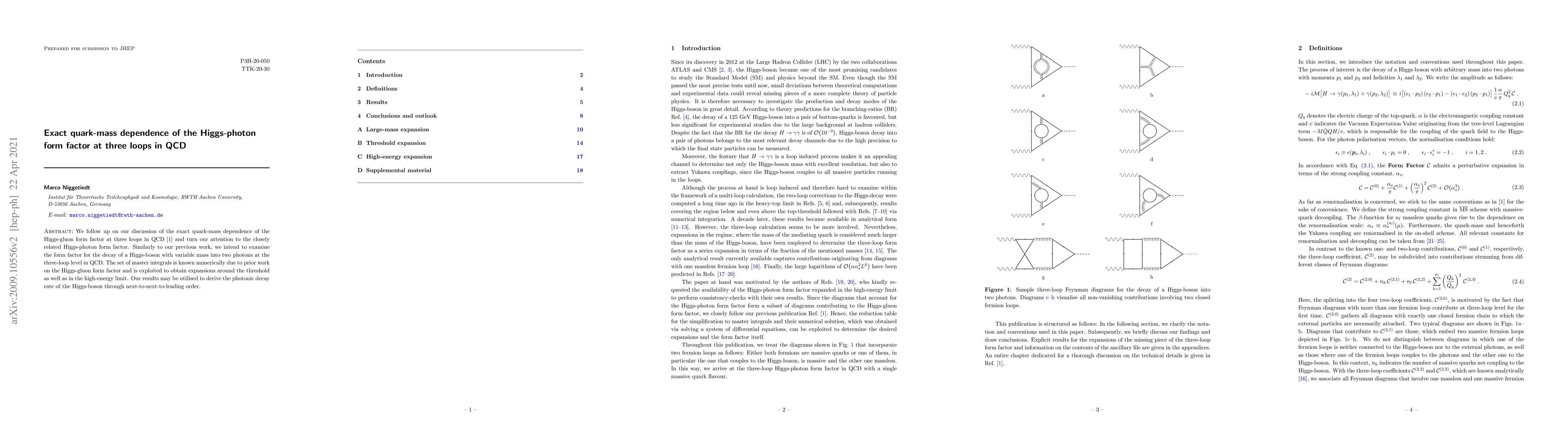 This paper investigates the exact quark-mass dependence of the Higgs-photon form factor at three loops in QCD, extending previous work on the Higgs-gluon form factor. The study aims to derive the photonic decay rate of the Higgs-boson through next-to-next-to-leading order using known numerical master integrals.