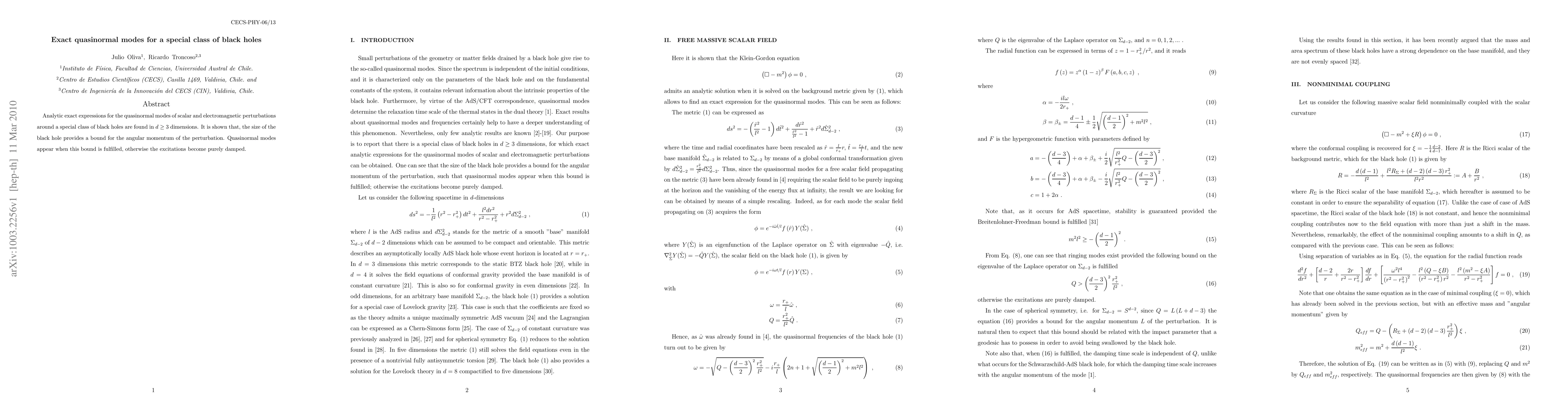 Analytic exact expressions for the quasinormal modes of scalar and electromagnetic perturbations around a special class of black holes are found in d\ge3 dimensions. It is shown that, the size of the black hole provides a bound for the angular momentum of the perturbation. Quasinormal modes appear when this bound is fulfilled, otherwise the excitations become purely damped.