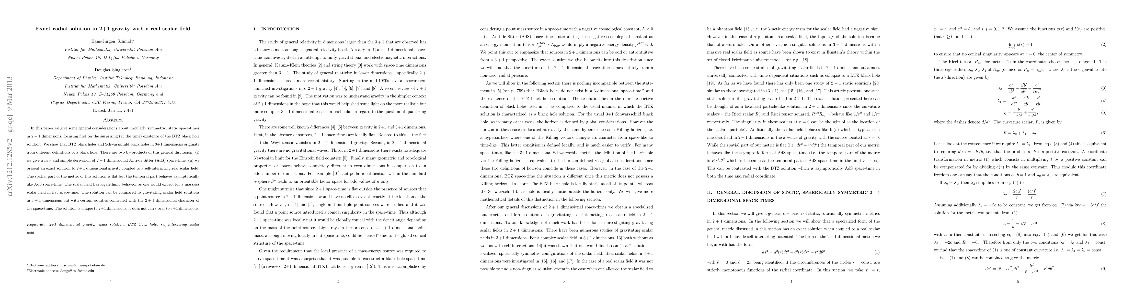 This paper explores circularly symmetric, static space-times in 2+1 dimensions, deriving a new exact solution for gravity coupled to a real scalar field, which exhibits unique 2+1 dimensional characteristics, including a flat spatial part and an asymptotically AdS temporal part. The study also highlights differences between BTZ black holes and 3+1 dimensional Schwarzschild black holes.