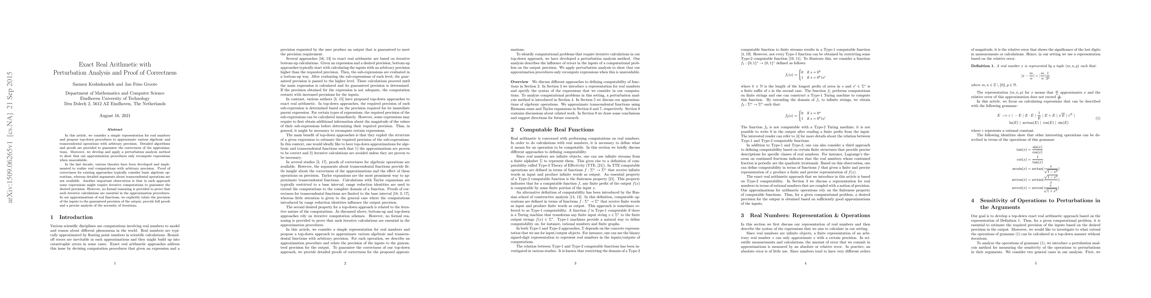 In this article, we consider a simple representation for real numbers and propose top-down procedures to approximate various algebraic and transcendental operations with arbitrary precision. Detailed algorithms and proofs are provided to guarantee the correctness of the approximations. Moreover, we develop and apply a perturbation analysis method to show that our approximation procedures only recompute expressions when unavoidable. In the last decade, various theories have been developed and implemented to realize real computations with arbitrary precision. Proof of correctness for existing approaches typically consider basic algebraic operations, whereas detailed arguments about transcendental operations are not available. Another important observation is that in each approach some expressions might require iterative computations to guarantee the desired precision. However, no formal reasoning is provided to prove that such iterative calculations are essential in the approximation procedures. In our approximations of real functions, we explicitly relate the precision of the inputs to the guaranteed precision of the output, provide full proofs and a precise analysis of the necessity of iterations.