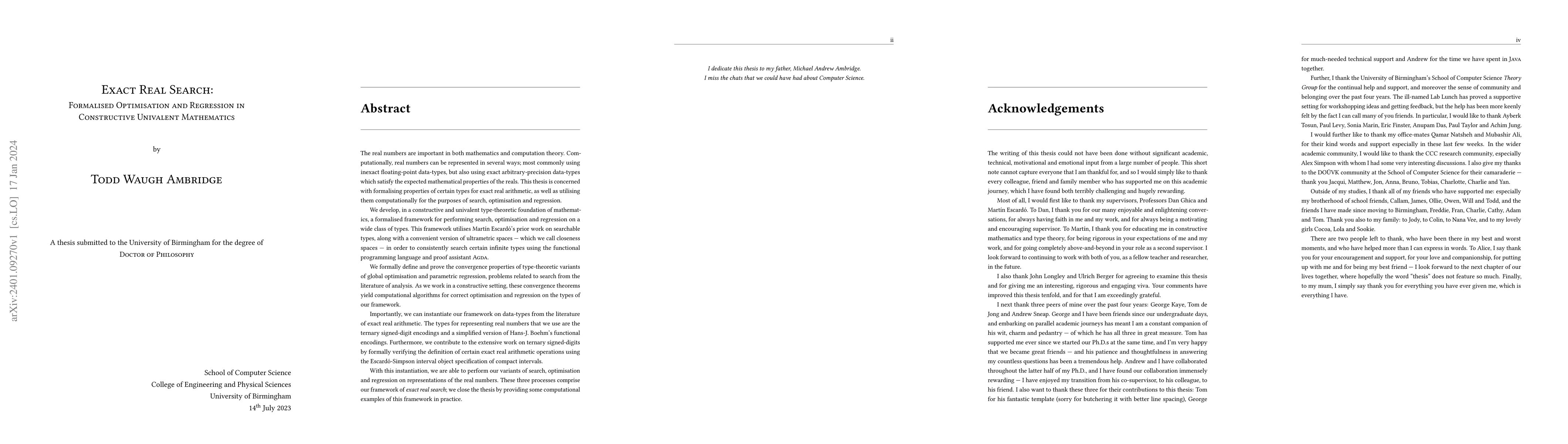 This research formalises optimisation and regression in constructive univalent mathematics using exact real arithmetic. It develops a framework for search and computational algorithms based on Martin Escardó's searchable types and closeness spaces, instantiating it on ternary signed-digit and functional encodings of real numbers.