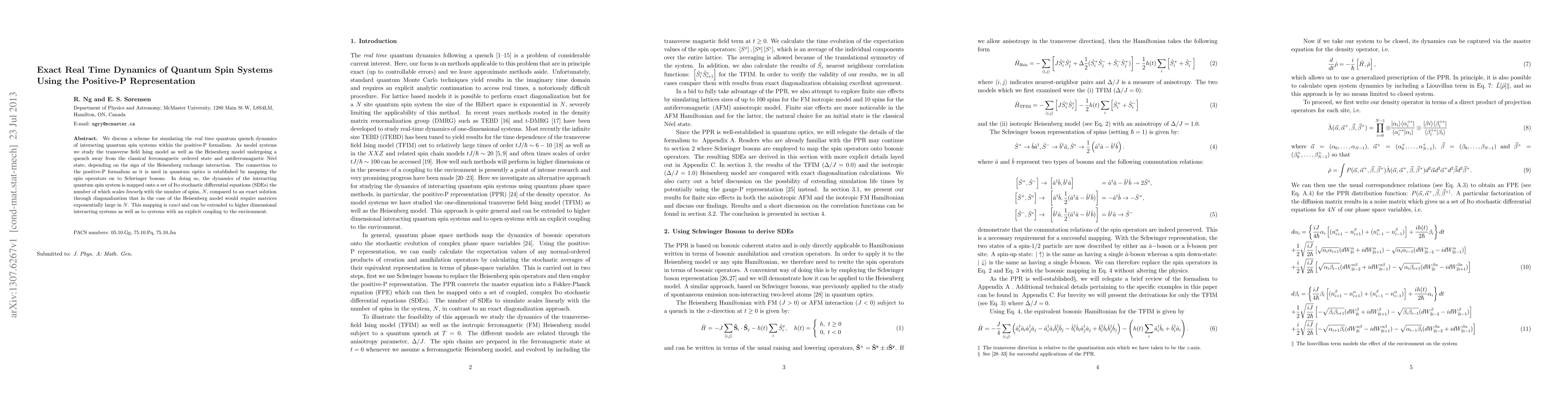We discuss a scheme for simulating the real time quantum quench dynamics of interacting quantum spin systems within the positive-P formalism. As model systems we study the transverse field Ising model as well as the Heisenberg model undergoing a quench away from the classical ferromagnetic ordered state and antiferromagnetic Neel state, depending on the sign of the Heisenberg exchange interaction. The connection to the positive-P formalism as it is used in quantum optics is established by mapping the spin operators on to Schwinger bosons. In doing so, the dynamics of the interacting quantum spin system is mapped onto a set of Ito stochastic differential equations (SDEs) the number of which scales linearly with the number of spins, N, compared to an exact solution through diagonalization that in the case of the Heisenberg model would require matrices exponentially large in N . This mapping is exact and can be extended to higher dimensional interacting systems as well as to systems with an explicit coupling to the environment.