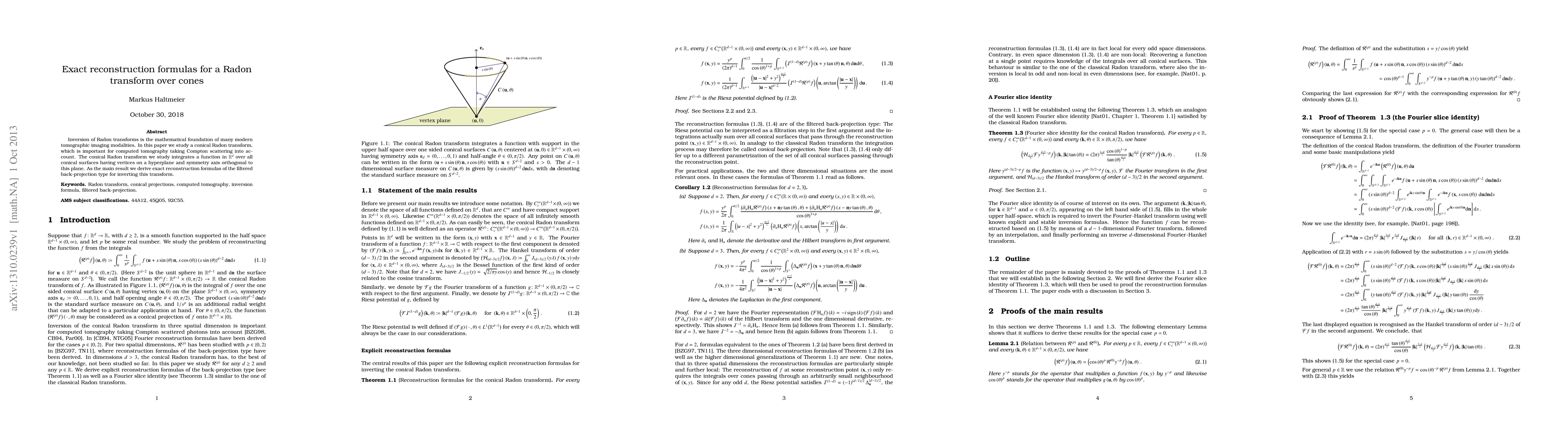 This paper develops exact reconstruction formulas for a conical Radon transform, crucial for advanced tomographic imaging that considers Compton scattering. The derived filtered back-projection type inversion method enables precise recovery of the original function from its conical projections.