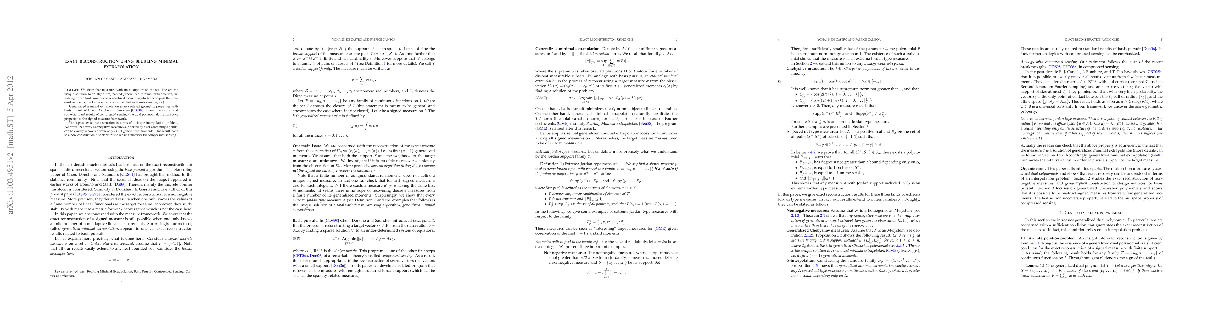 We show that measures with finite support on the real line are the unique solution to an algorithm, named generalized minimal extrapolation, involving only a finite number of generalized moments (which encompass the standard moments, the Laplace transform, the Stieltjes transformation, etc). Generalized minimal extrapolation shares related geometric properties with basis pursuit of Chen, Donoho and Saunders [CDS98]. Indeed we also extend some standard results of compressed sensing (the dual polynomial, the nullspace property) to the signed measure framework. We express exact reconstruction in terms of a simple interpolation problem. We prove that every nonnegative measure, supported by a set containing s points,can be exactly recovered from only 2s + 1 generalized moments. This result leads to a new construction of deterministic sensing matrices for compressed sensing.
