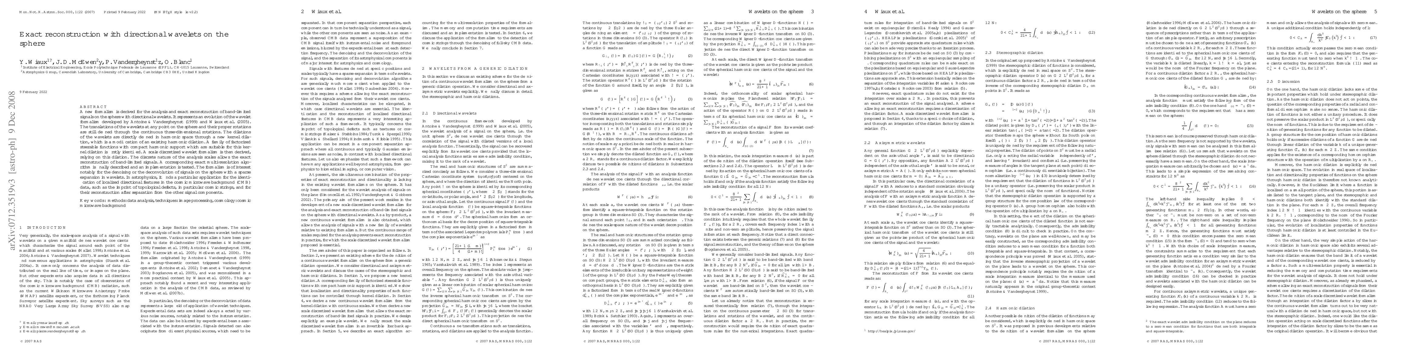 This paper introduces a new formalism for exact reconstruction of band-limited signals on the sphere using directional wavelets, evolving from previous wavelet theories. It employs a modified kernel dilation and a family of steerable functions for precise multi-resolution analysis, with applications in astrophysics for identifying and reconstructing features in cosmic microwave background data.