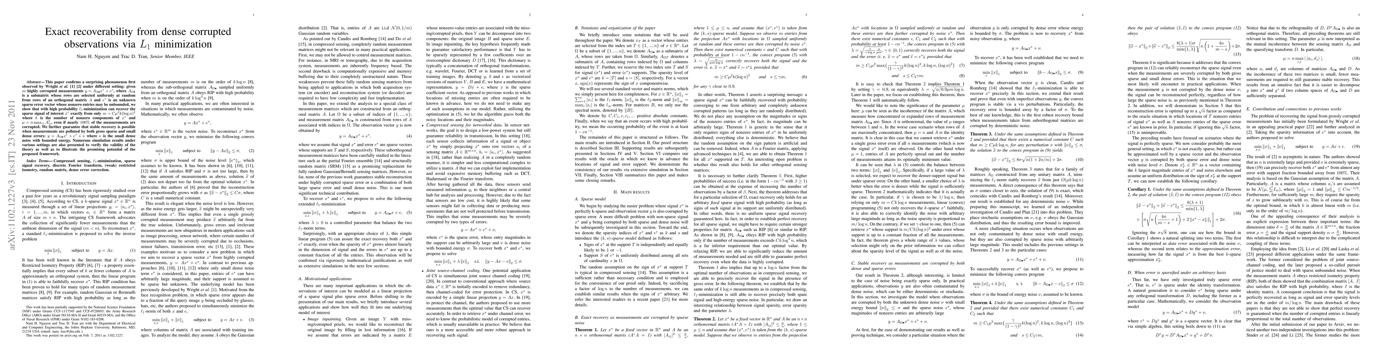 Researchers show that using $L_1$ minimization can recover a sparse signal exactly from highly corrupted measurements with high probability, even in nearly 100% of cases. They demonstrate this is possible for $m = C rac{ ext{number of nonzero components}}{( ext{log number of rows})^2}$ measurements.