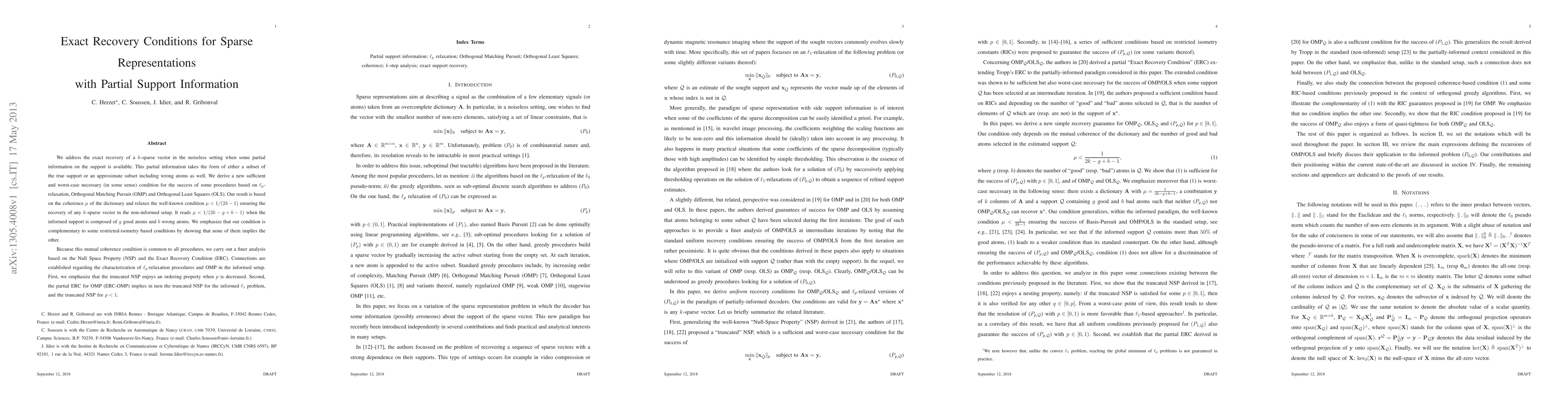 This paper derives new sufficient and necessary conditions for exact recovery of k-sparse vectors with partial support information, improving upon the traditional coherence condition. It introduces a modified coherence "mu" criterion based on the dictionary's coherence and the quality of the partial support information, providing a more flexible framework for lp-relaxation, OMP, and OLS procedures.