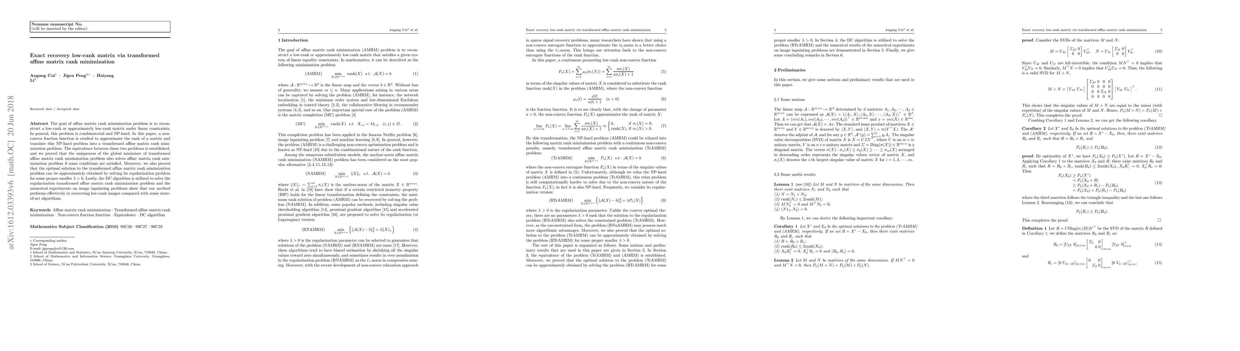 This paper proposes a nonconvex fractional function to approximate matrix rank and transforms the NP-hard affine matrix rank minimization problem into a solvable form. It proves that the optimal solution of the transformed problem can be obtained via regularization and solved using the DC algorithm, demonstrating effective performance in low-rank image recovery.
