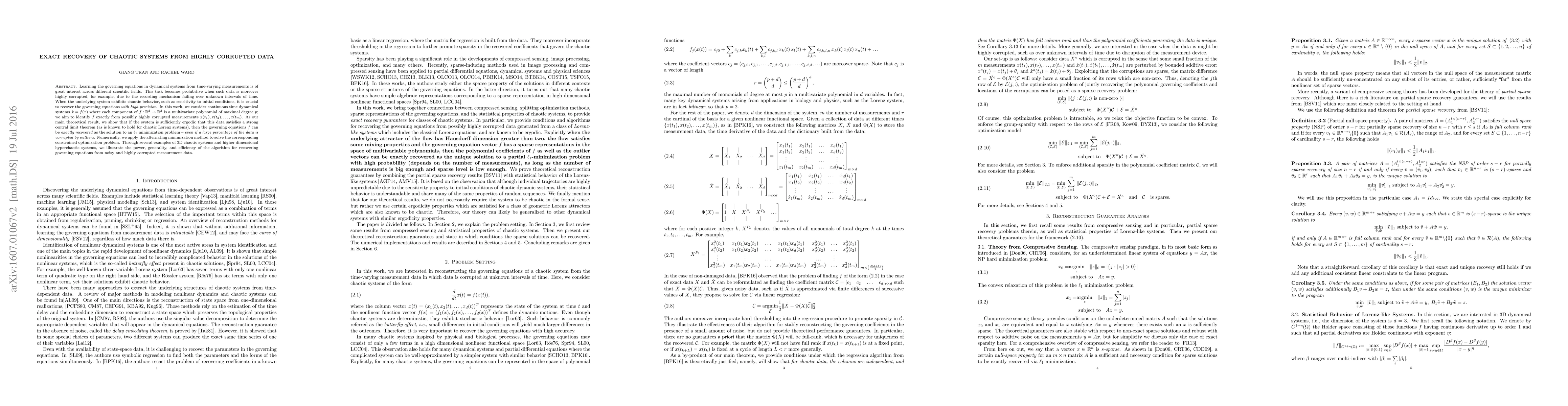 Learning the governing equations in dynamical systems from time-varying measurements is of great interest across different scientific fields. This task becomes prohibitive when such data is moreover highly corrupted, for example, due to the recording mechanism failing over unknown intervals of time. When the underlying system exhibits chaotic behavior, such as sensitivity to initial conditions, it is crucial to recover the governing equations with high precision. In this work, we consider continuous time dynamical systems $\dot{x} = f(x)$ where each component of $f: \mathbb{R}^{d} \rightarrow \mathbb{R}^d$ is a multivariate polynomial of maximal degree $p$; we aim to identify $f$ exactly from possibly highly corrupted measurements $x(t_1), x(t_2), \dots, x(t_m)$. As our main theoretical result, we show that if the system is sufficiently ergodic that this data satisfies a strong central limit theorem (as is known to hold for chaotic Lorenz systems), then the governing equations $f$ can be exactly recovered as the solution to an $\ell_1$ minimization problem -- even if a large percentage of the data is corrupted by outliers. Numerically, we apply the alternating minimization method to solve the corresponding constrained optimization problem. Through several examples of 3D chaotic systems and higher dimensional hyperchaotic systems, we illustrate the power, generality, and efficiency of the algorithm for recovering governing equations from noisy and highly corrupted measurement data.