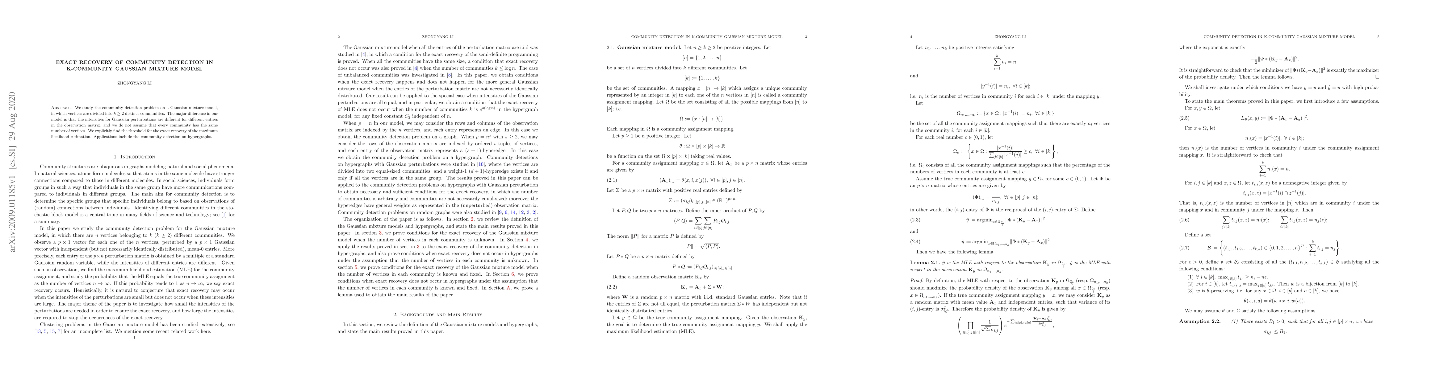 We study the community detection problem on a Gaussian mixture model, in which vertices are divided into $k\geq 2$ distinct communities. The major difference in our model is that the intensities for Gaussian perturbations are different for different entries in the observation matrix, and we do not assume that every community has the same number of vertices. We explicitly find the threshold for the exact recovery of the maximum likelihood estimation. Applications include the community detection on hypergraphs.