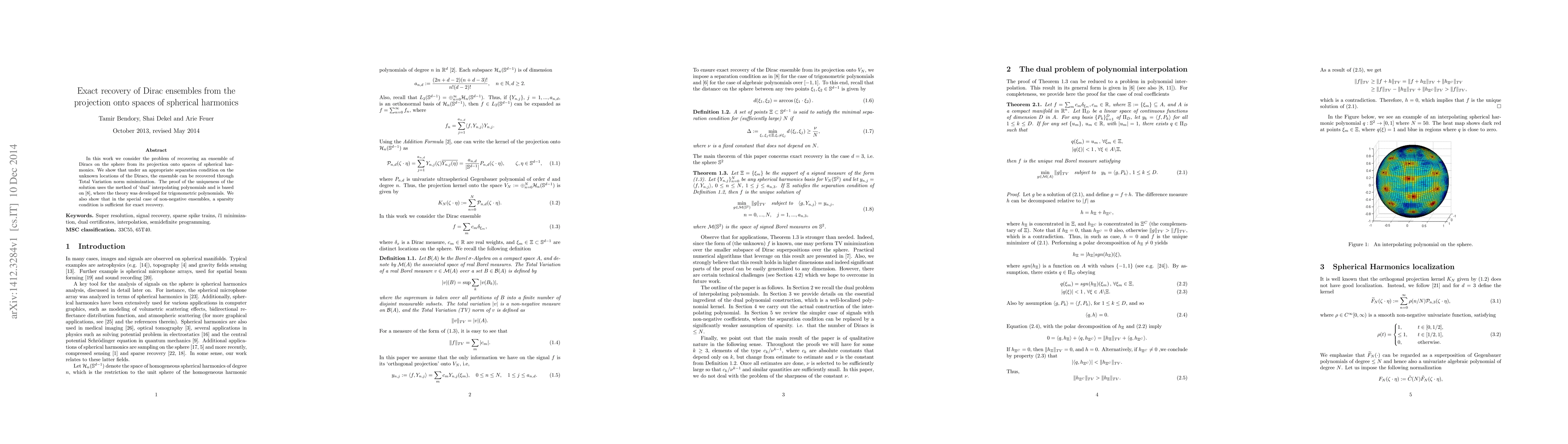 In this work we consider the problem of recovering an ensemble of Diracs on the sphere from its projection onto spaces of spherical harmonics. We show that under an appropriate separation condition on the unknown locations of the Diracs, the ensemble can be recovered through Total Variation norm minimization. The proof of the uniqueness of the solution uses the method of `dual' interpolating polynomials and is based on [8], where the theory was developed for trigonometric polynomials. We also show that in the special case of non-negative ensembles, a sparsity condition is sufficient for exact recovery.