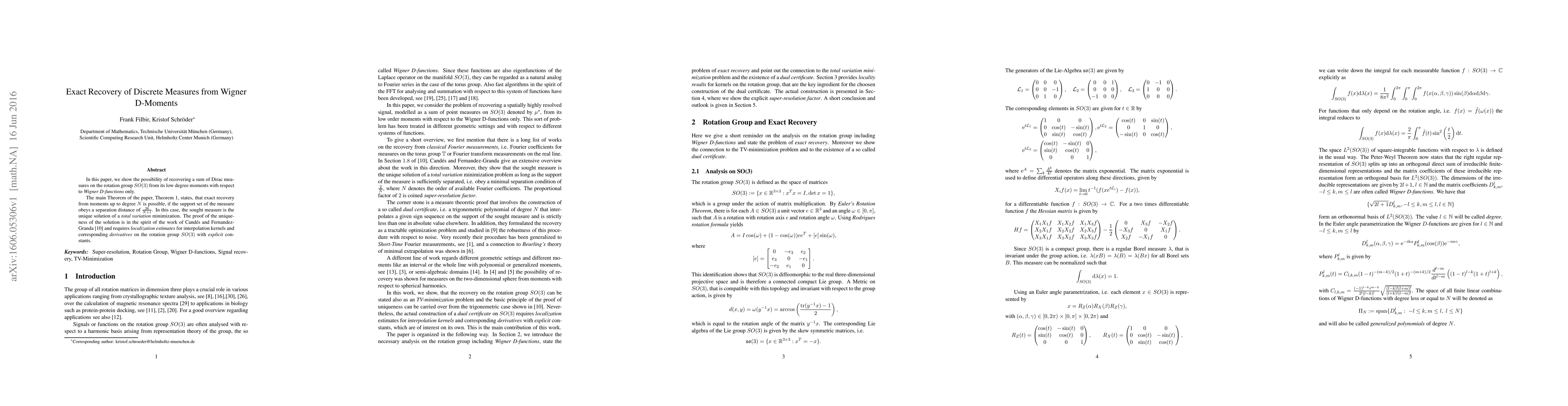 This paper demonstrates the exact recovery of a sum of Dirac measures on the rotation group $SO(3)$ using low-degree moments with respect to Wigner D-functions. The main theorem proves that exact recovery is feasible if the support set maintains a separation distance of $\frac{36}{N+1}$, ensuring the measure is the unique solution of a total variation minimization.
