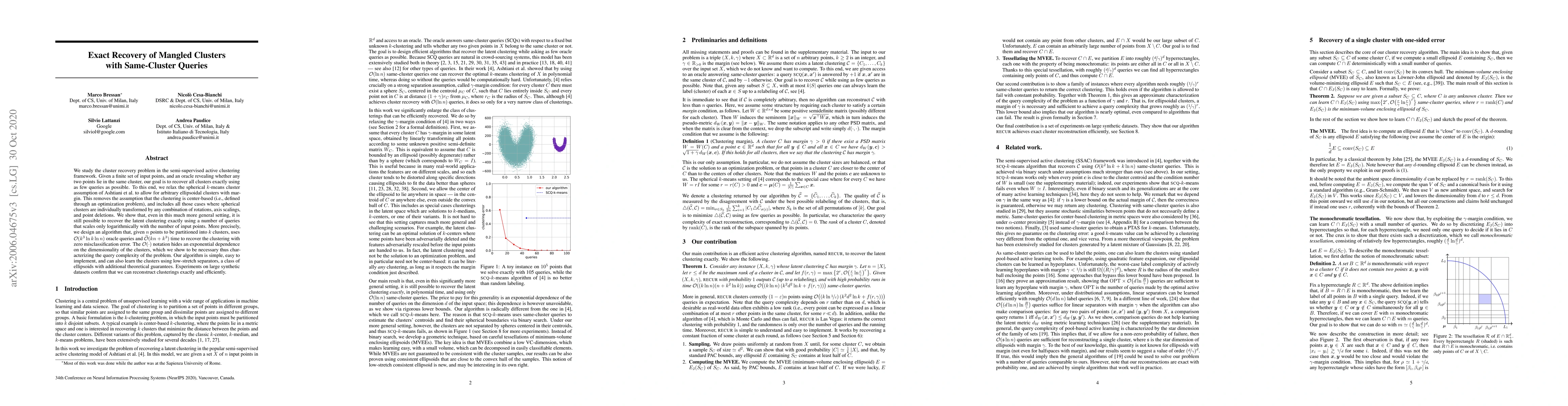 This paper proposes an algorithm to recover arbitrary ellipsoidal clusters from a set of input points using same-cluster queries, achieving exact recovery with logarithmic scaling in the number of points. The algorithm requires $O(k^3 \ln k \ln n)$ oracle queries and $\tilde{O}(kn + k^3)$ time, demonstrating the feasibility of efficient cluster recovery in a generalized setting.