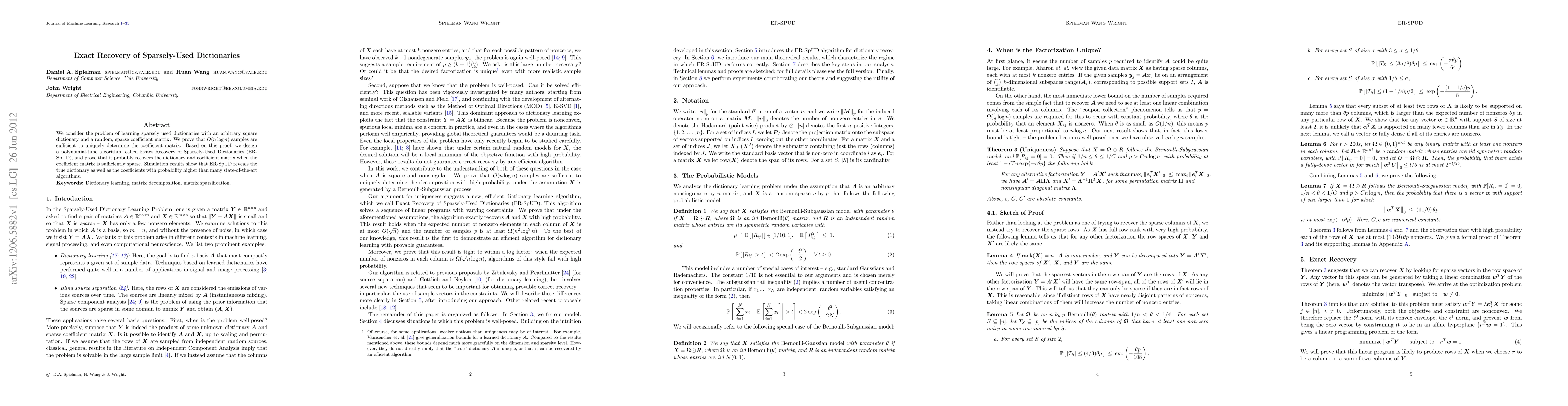 We consider the problem of learning sparsely used dictionaries with an arbitrary square dictionary and a random, sparse coefficient matrix. We prove that $O (n \log n)$ samples are sufficient to uniquely determine the coefficient matrix. Based on this proof, we design a polynomial-time algorithm, called Exact Recovery of Sparsely-Used Dictionaries (ER-SpUD), and prove that it probably recovers the dictionary and coefficient matrix when the coefficient matrix is sufficiently sparse. Simulation results show that ER-SpUD reveals the true dictionary as well as the coefficients with probability higher than many state-of-the-art algorithms.