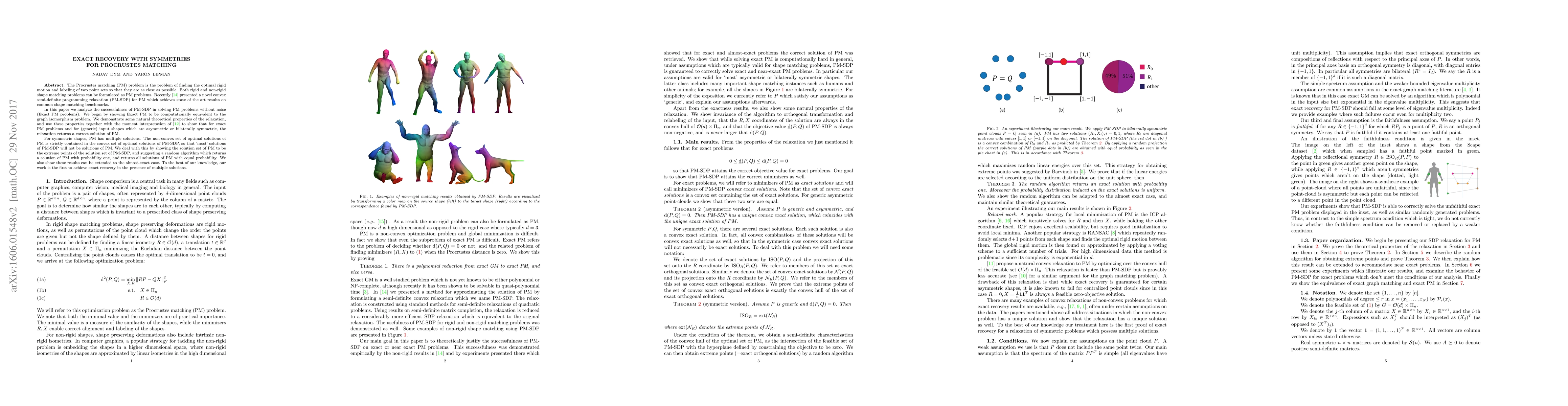 The Procrustes matching (PM) problem is the problem of finding the optimal rigid motion and labeling of two point sets so that they are as close as possible. Both rigid and non-rigid shape matching problems can be formulated as PM problems. Recently [Maron et al.] presented a novel convex semi-definite programming relaxation (PM-SDP) for PM which achieves state of the art results on common shape matching benchmarks. In this paper we analyze the successfulness of PM-SDP in solving PM problems without noise (Exact PM problems). We begin by showing Exact PM to be computationally equivalent to the graph isomorphism problem. We demonstrate some natural theoretical properties of the relaxation, and use these properties together with the moment interpretation of [Lasserre] to show that for exact PM problems and for (generic) input shapes which are asymmetric or bilaterally symmetric, the relaxation returns a correct solution of PM. For symmetric shapes, PM has multiple solutions. The non-convex set of optimal solutions of PM is strictly contained in the convex set of optimal solutions of PM-SDP, so that `most' solutions of PM-SDP will not be solutions of PM. We deal with this by showing the solution set of PM to be the extreme points of the solution set of PM-SDP, and suggesting a random algorithm which returns a solution of PM with probability one, and returns all solutions of PM with equal probability. We also show these results can be extended to the almost-exact case. To the best of our knowledge, our work is the first to achieve exact recovery in the presence of multiple solutions.