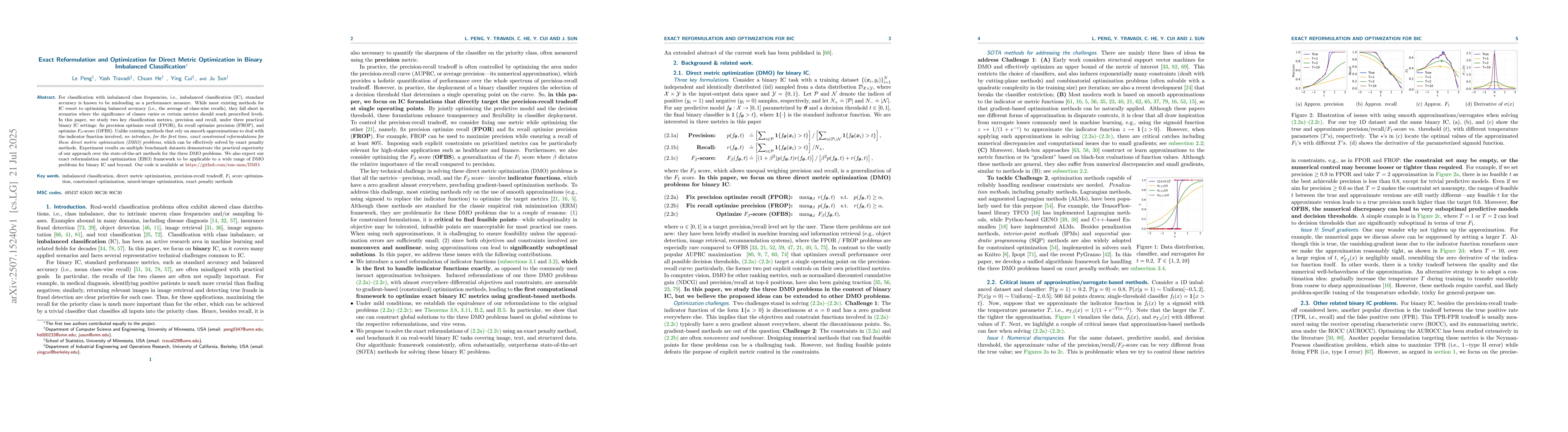 For classification with imbalanced class frequencies, i.e., imbalanced classification (IC), standard accuracy is known to be misleading as a performance measure. While most existing methods for IC resort to optimizing balanced accuracy (i.e., the average of class-wise recalls), they fall short in scenarios where the significance of classes varies or certain metrics should reach prescribed levels. In this paper, we study two key classification metrics, precision and recall, under three practical binary IC settings: fix precision optimize recall (FPOR), fix recall optimize precision (FROP), and optimize $F_\beta$-score (OFBS). Unlike existing methods that rely on smooth approximations to deal with the indicator function involved, \textit{we introduce, for the first time, exact constrained reformulations for these direct metric optimization (DMO) problems}, which can be effectively solved by exact penalty methods. Experiment results on multiple benchmark datasets demonstrate the practical superiority of our approach over the state-of-the-art methods for the three DMO problems. We also expect our exact reformulation and optimization (ERO) framework to be applicable to a wide range of DMO problems for binary IC and beyond. Our code is available at https://github.com/sun-umn/DMO.