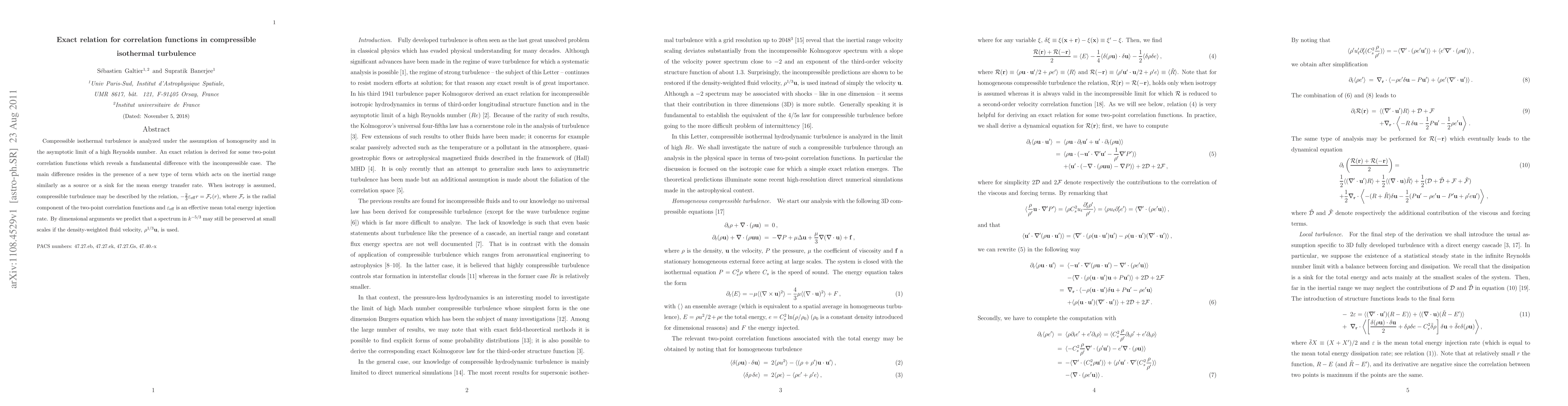 This paper derives an exact relation for two-point correlation functions in compressible isothermal turbulence, highlighting a fundamental difference from incompressible turbulence due to a new term affecting the inertial range. Under isotropy, the relation is $- {2 \over 3} \epsilon_{\rm{eff}} r = {\cal F}_r(r)$, predicting a $k^{-5/3}$ spectrum at small scales when using the density-weighted fluid velocity.