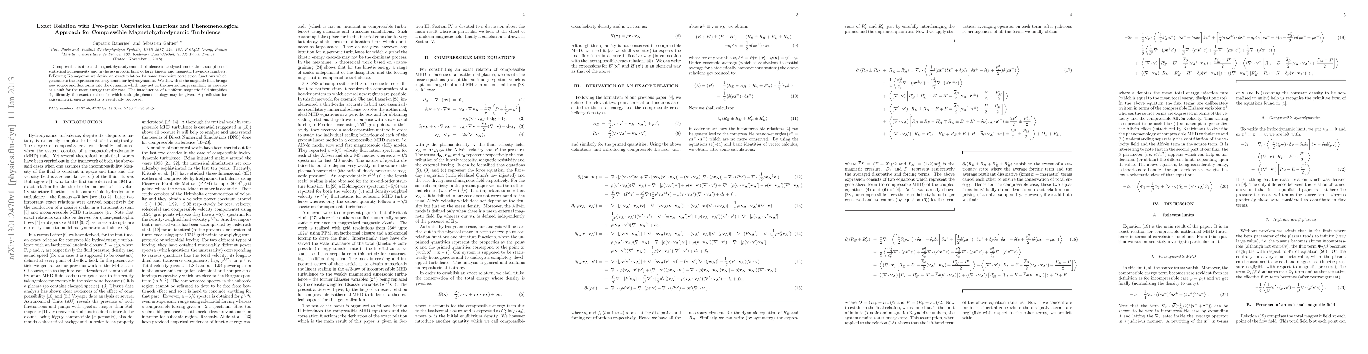 This paper derives an exact relation for two-point correlation functions in compressible magnetohydrodynamic turbulence, generalizing hydrodynamic expressions. It introduces new source and flux terms due to magnetic fields, proposing a simplified phenomenology and predicting axisymmetric energy spectra.