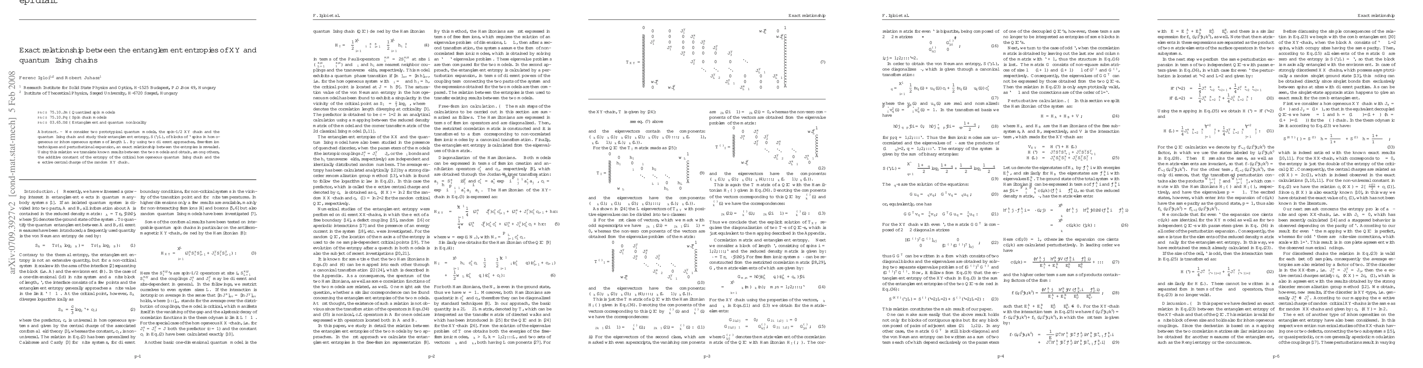 We consider two prototypical quantum models, the spin-1/2 XY chain and the quantum Ising chain and study their entanglement entropy, S(l,L), of blocks of l spins in homogeneous or inhomogeneous systems of length L. By using two different approaches, free-fermion techniques and perturbational expansion, an exact relationship between the entropies is revealed. Using this relation we translate known results between the two models and obtain, among others, the additive constant of the entropy of the critical homogeneous quantum Ising chain and the effective central charge of the random XY chain.