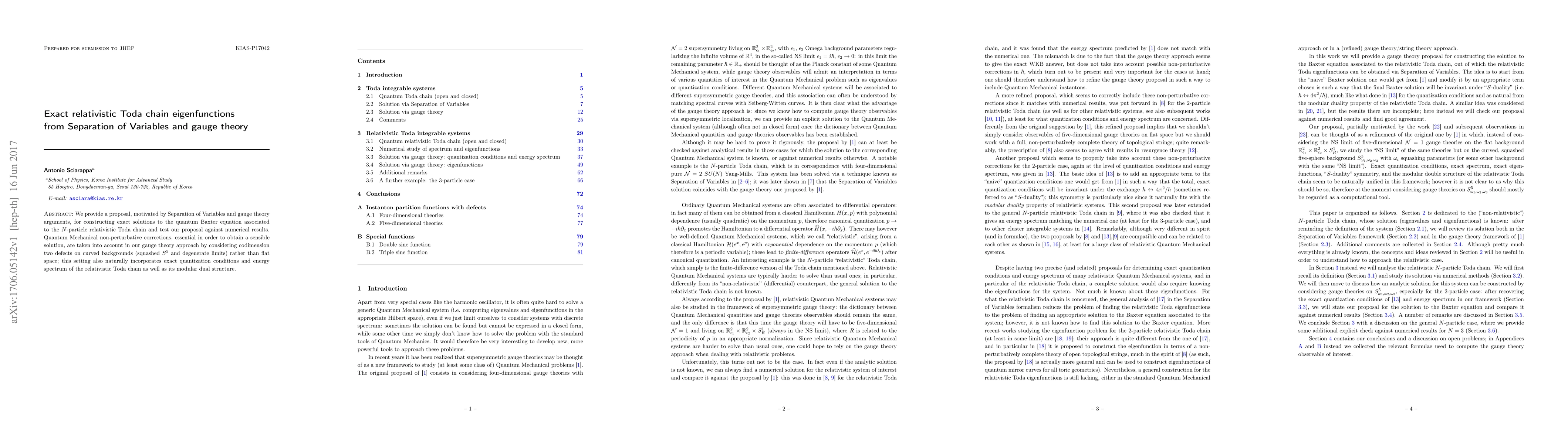 This research proposes a method for constructing exact solutions to the quantum Baxter equation for the $N$-particle relativistic Toda chain using Separation of Variables and gauge theory, validated through numerical results and considering non-perturbative quantum corrections by examining codimension two defects on curved backgrounds.