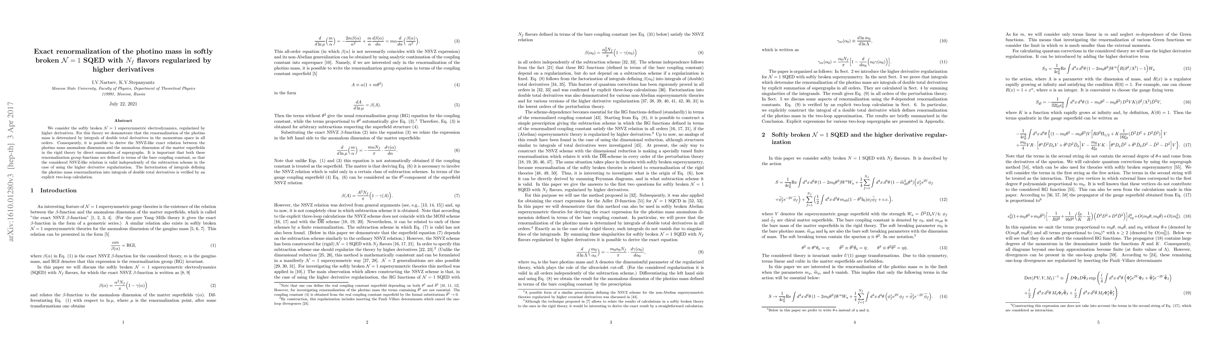 This paper demonstrates exact renormalization of the photino mass in softly broken ${\cal N}=1$ supersymmetric electrodynamics regularized by higher derivatives. It shows that the photino mass renormalization is determined by integrals of double total derivatives, leading to an NSVZ-like exact relation between the photino mass anomalous dimension and the matter superfields' anomalous dimension in the rigid theory.