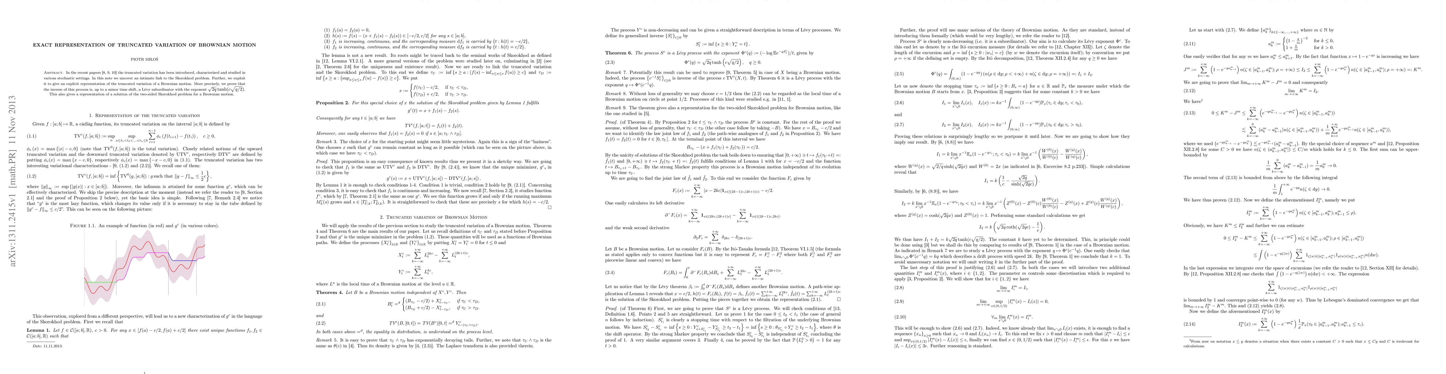 In the recent papers [Lochowski:2011fk, Lochowski:2013yq, Lochowski:2013lr] the truncated variation has been introduced, characterized and studied in various stochastic settings. In this note we uncover an intimate link to the Skorokhod problem. Further, we exploit it to give an explicit representation of the truncated variation of a Brownian motion. More precisely, we prove that the inverse of this process is, up to a minor time shift, a L\'evy subordinator with the exponent \sqrt{2q}\tanh(c\sqrt{q/2}) . This also gives a representation of a solution of the two-sided Skorokhod problem for a Brownian motion.