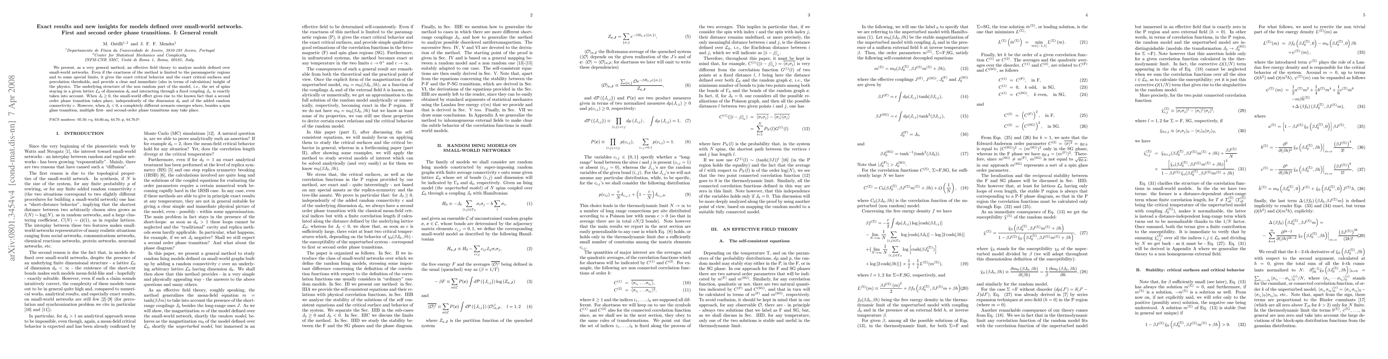 We present, as a very general method, an effective field theory to analyze models defined over small-world networks. Even if the exactness of the method is limited to the paramagnetic regions and to some special limits, it gives the exact critical behavior and the exact critical surfaces and percolation thresholds, and provide a clear and immediate (also in terms of calculation) insight of the physics. The underlying structure of the non random part of the model, i.e., the set of spins staying in a given lattice L_0 of dimension d_0 and interacting through a fixed coupling J_0, is exactly taken into account. When J_0\geq 0, the small-world effect gives rise to the known fact that a second order phase transition takes place, independently of the dimension d_0 and of the added random connectivity c. However, when J_0<0, a completely different scenario emerges where, besides a spin glass transition, multiple first- and second-order phase transitions may take place.
