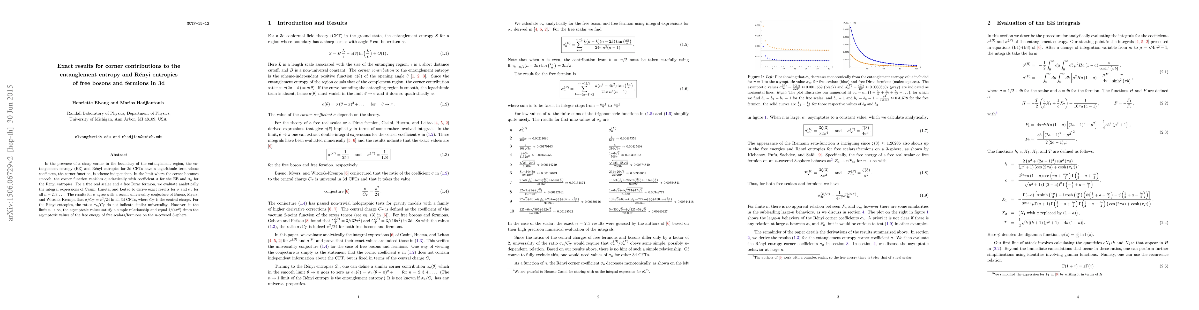 In the presence of a sharp corner in the boundary of the entanglement region, the entanglement entropy (EE) and Renyi entropies for 3d CFTs have a logarithmic term whose coefficient, the corner function, is scheme-independent. In the limit where the corner becomes smooth, the corner function vanishes quadratically with coefficient $\sigma$ for the EE and $\sigma_n$ for the Renyi entropies. For a free real scalar and a free Dirac fermion, we evaluate analytically the integral expressions of Casini, Huerta, and Leitao to derive exact results for $\sigma$ and $\sigma_n$ for all $n=2,3,\dots$. The results for $\sigma$ agree with a recent universality conjecture of Bueno, Myers, and Witczak-Krempa that $\sigma/C_T = \pi^2/24$ in all 3d CFTs, where $C_T$ is the central charge. For the Renyi entropies, the ratios $\sigma_n/C_T$ do not indicate similar universality. However, in the limit $n \to \infty$, the asymptotic values satisfy a simple relationship and equal $1/(4\pi^2)$ times the asymptotic values of the free energy of free scalars/fermions on the $n$-covered 3-sphere.
