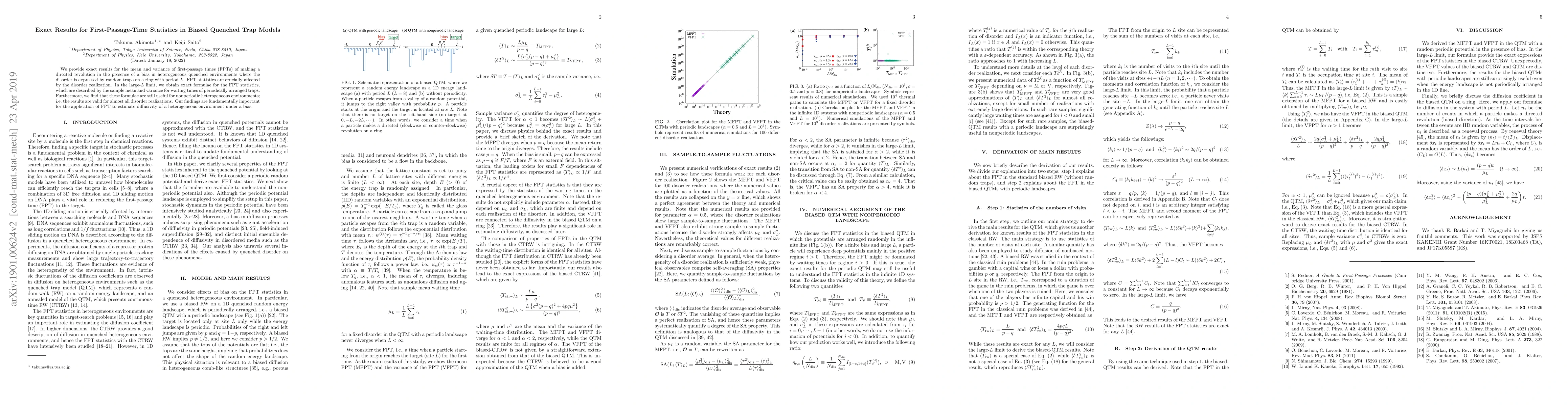 This paper presents exact results for the mean and variance of first-passage times in biased quenched trap models, showing how disorder affects these statistics. In large systems, it derives exact formulae for FPT statistics that are applicable to both periodic and nonperiodic heterogeneous environments, which is crucial for estimating diffusivity in biased systems.