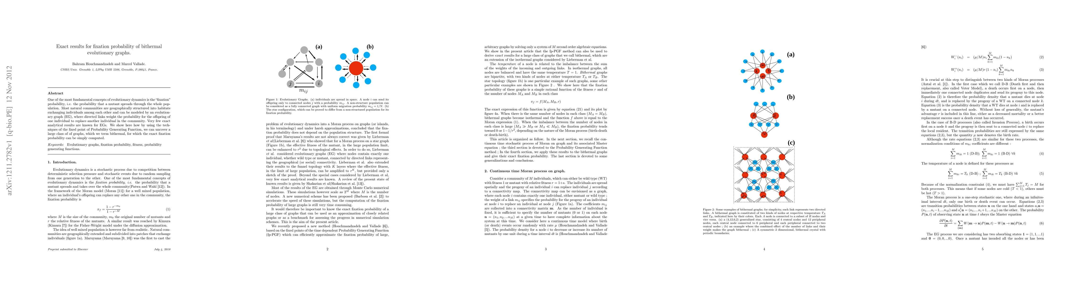 One of the most fundamental concepts of evolutionary dynamics is the "fixation" probability, i.e. the probability that a mutant spreads through the whole population. Most natural communities are geographically structured into habitats exchanging individuals among each other and can be modeled by an evolutionary graph (EG), where directed links weight the probability for the offspring of one individual to replace another individual in the community. Very few exact analytical results are known for EGs. We show here how by using the techniques of the fixed point of Probability Generating Function, we can uncover a large class of of graphs, which we term bithermal, for which the exact fixation probability can be simply computed.