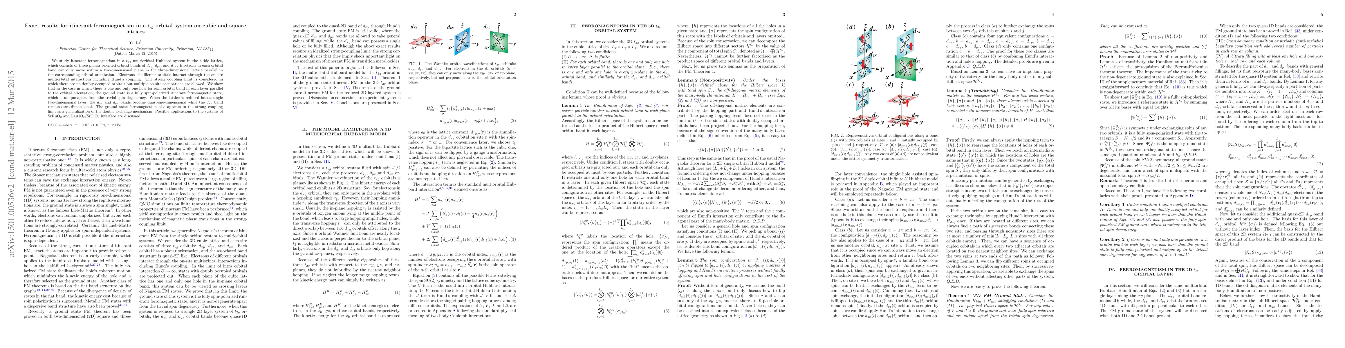 This paper investigates itinerant ferromagnetism in a $t_{2g}$ orbital Hubbard model on cubic and square lattices, demonstrating that the ground state is fully spin-polarized when there is one hole per orbital band in each layer. The study extends to quasi-one-dimensional systems and discusses potential applications to materials like SrRuO$_3$ and LaAlO$_3$/SrTiO$_3$ interface.