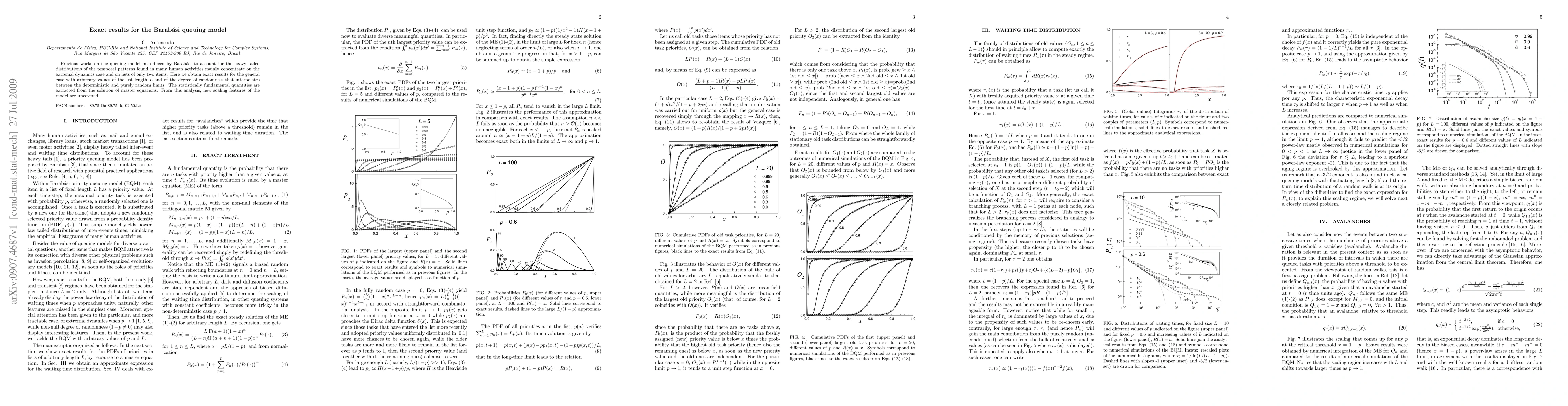 The paper presents exact solutions for the Barabasi queuing model with arbitrary list length and randomness degree, uncovering new scaling features and providing asymptotic expressions for priority distributions and waiting times.