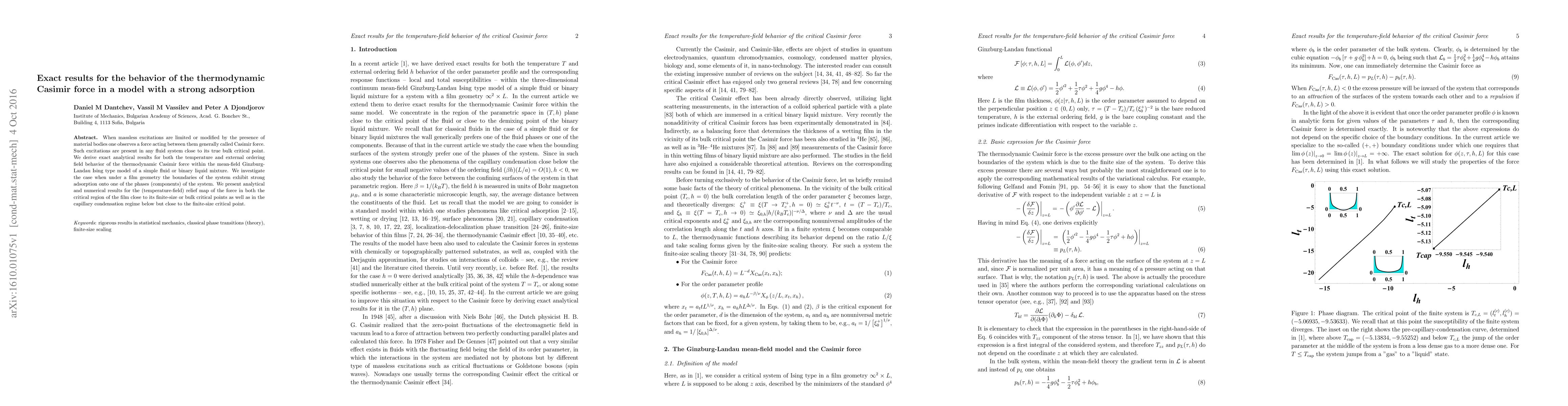 This paper derives exact analytical results for the thermodynamic Casimir force in a fluid system near its critical point, focusing on scenarios with strong adsorption onto one of the fluid's phases. It examines the force's behavior under film geometry and provides detailed analytical and numerical insights into its temperature and external field dependencies.