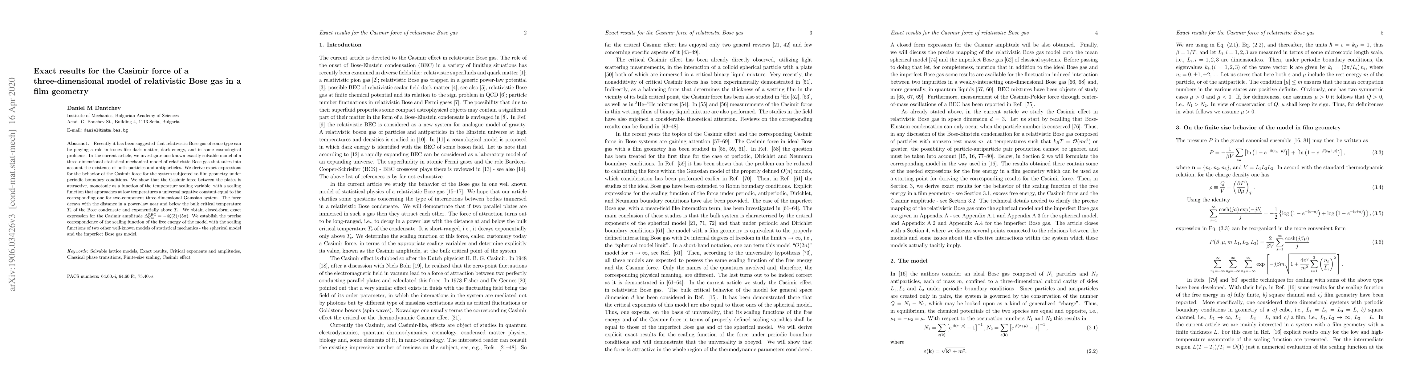 Recently it has been suggested that relativistic Bose gas of some type can be playing role in issues like dark matter, dark energy, and in some cosmological problems. In the current article we investigate one known exactly solvable model of three-dimensional statistical-mechanical model of relativistic Bose gas that takes into account the existence of both particles and antiparticles. We derive exact expressions for the behavior of the Casimir force for the system subjected to film geometry under periodic boundary conditions. We show that the Casimir force between the plates is attractive, monotonic as a function of the temperature scaling variable, with a scaling function that approaches at low temperatures a universal negative constant equal to the corresponding one for two-component three dimensional Gaussian system. The force decays with the distance in a power law near and below the bulk critical temperature $T_c$ of the Bose condensate and exponentially above $T_c$. We obtain closed form exact expression for the Casimir amplitude $\Delta_{\rm Cas}^{\rm RBG} =-4\zeta(3)/(5\pi)$. We establish the precise correspondence of the scaling function of the free energy of the model with the scaling functions of two other well-known models of statistical mechanics - the spherical model and the imperfect Bose gas model.